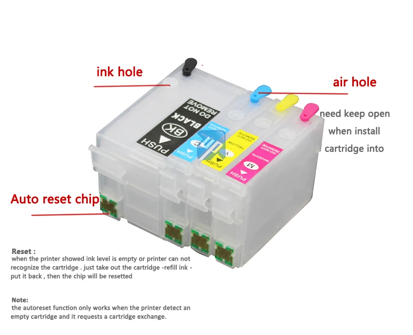 T2701-T2704 T2711-T2714Особенности:1.Больше нет покупки чернильного картриджа, больше нет замены картриджа. Он может быть заполнен многоразового чернильного картриджа позволяет бесчисленные пополнения, экономит до 95% стоимости печати. 2.Не требует чипа resetter. Он с чипами автоматического сброса, он будет автоматически восстановлен, когда уровень чернил показывает пустой (просто откройте крышку принтера, выньте его, затем повторно установите его снова). 3.Пустые многоразовые чернильные картриджи, могут быть заполнены 12-15 мл всех типов чернил, красителей, пигментов,Сублимация,Съедобные, растворяющие чернила и т. Д. 4.Более удобно, чем СНПЧ (Система непрерывной подачи чернил) с использованием, с трубами или трубами, таким образом, не нужно беспокоиться о ловушке пузырьков и давления чернил.