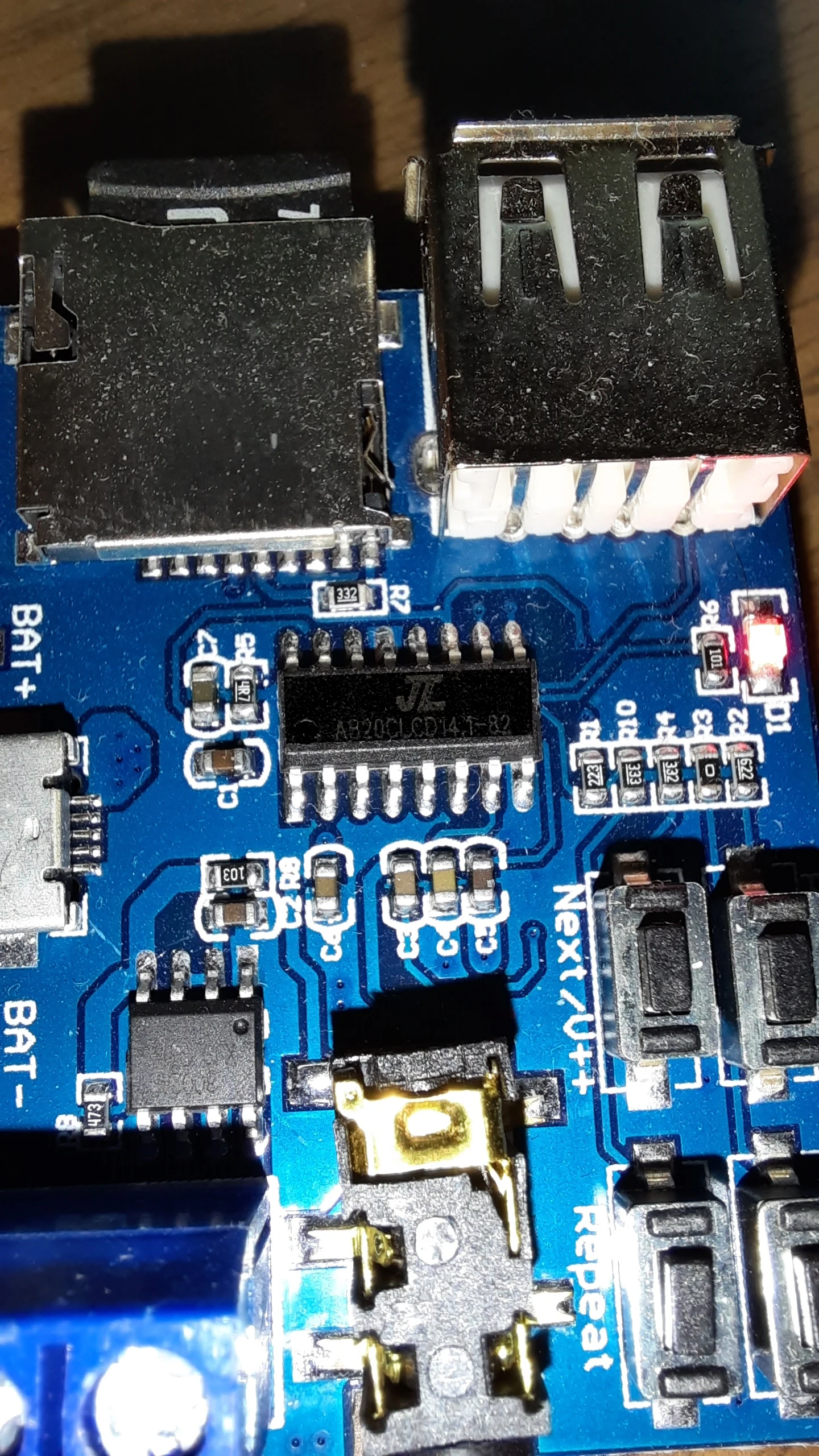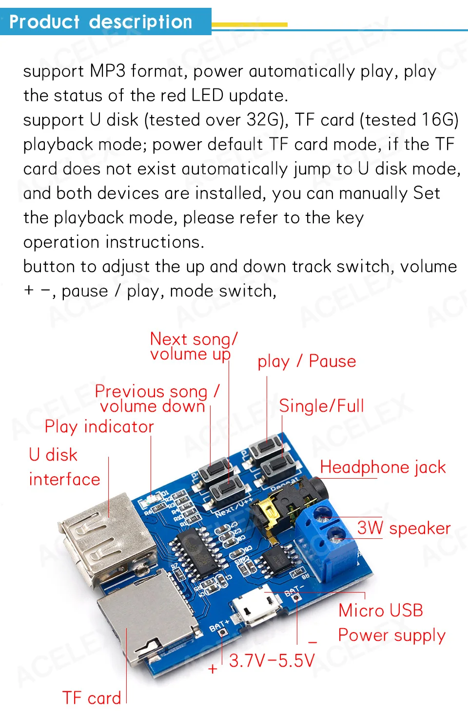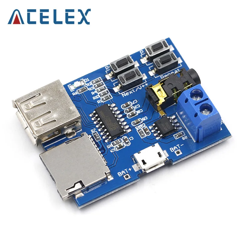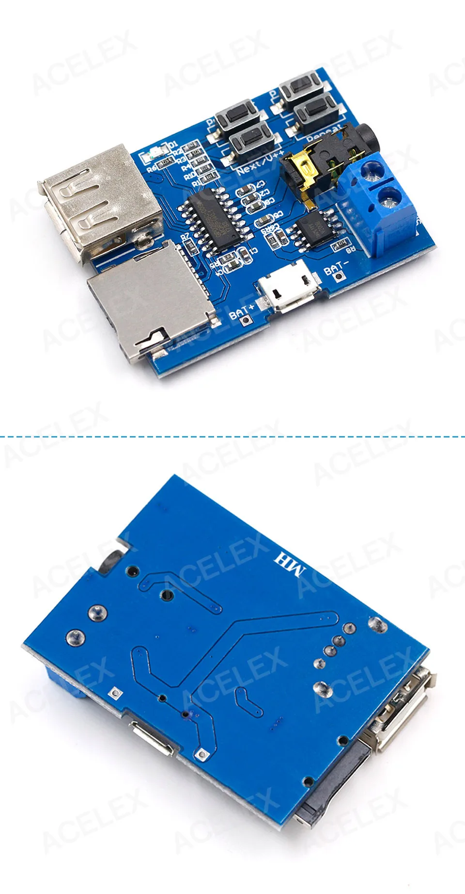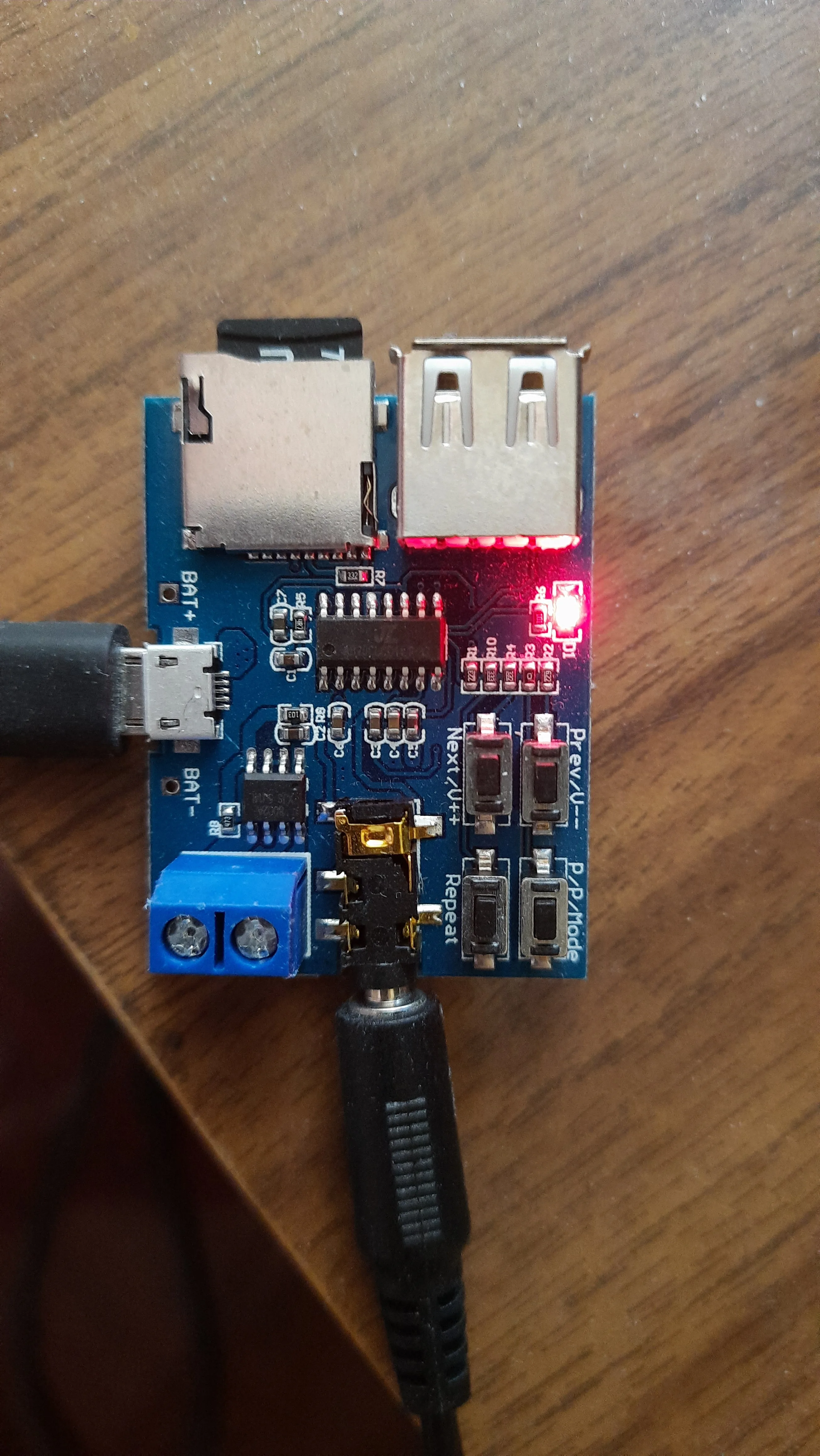Отлично работает с USB и microSD картами. В наушниках громкости достаточно. При установке usb или microsd автоматически выбирает источник. Есть громкость +/-, трек вперед/назад, пауза/стоп, режим воспроизведения по кругу/одиночный. На контакты BAT+ и BAT- выдаёт 5В (но это при питании от блока 5в, возможно если подавать 3,7в то такое же напряжение будет и на этих контактах). Сопротивление на контактах для подключения динамика ~7 Ом.