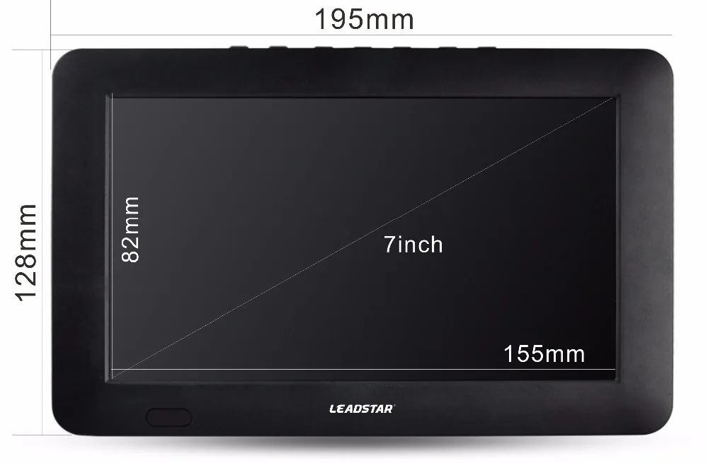 * Дисплей: 7 "цветной TFT-LED* Соотношение размеров экрана: 16:9* Пиковая Яркость: 500cd/М2 * Контрастность: 300:1* Угол обзора: 165 градусов* Время отклика: 8 мс* Потребляемая мощность: <20 Вт* Поддержка медиаформатов: rmvb,avi,mov,mkv,3gp,mp4 и т. д.* Аудио: 2*1 Вт* Питание: DC12V-1.5A* Аккумулятор: литий-полимерный 7,4 V 800mAh