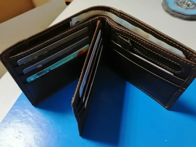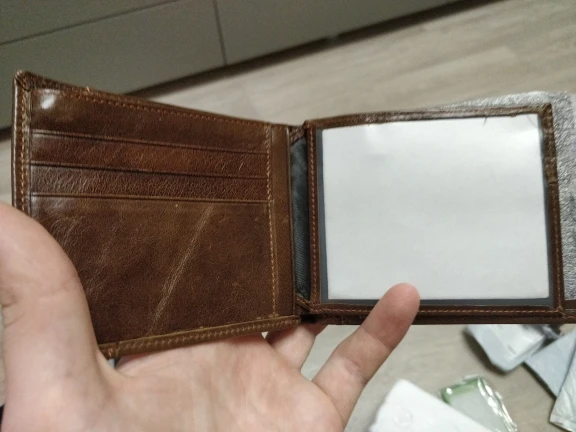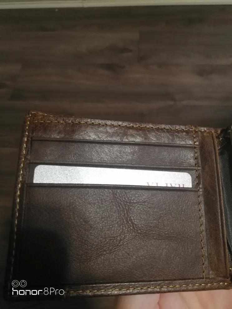 Выглядит хорошо, вполне солидно. Кожа. С небольшими потертостями как на фото продавца. Чуть длиннее, чем стандартное портмоне, где-то на 1см. Подклад обычный, темный, без логотипов. Карточки влезают легко и без усилий, не надо с разбега впихивать, а потом ногти ломать, чтобы вытащить.