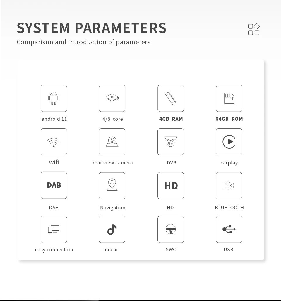 0. Встроенный беспроводной Carplay и Android Auto1.1024X600 HD емкостный сенсорный экран, DSP2. Процессор: Android 11 64 бит четырехъядерный ARM A7 4*1,8 ГГц3. Оперативная память (память): 2 ГБ DDR34.Inand Flash: 32 ГБ