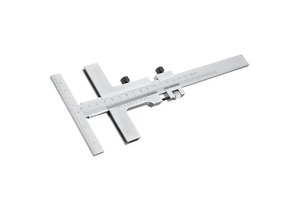 Диапазон измерения: 160 мм Чтение: 0,05 мм Длина Т-бар: 100 мм С мм-градацией по краю Т-бар • Специальная сталь, закаленная, с тонкой регулировкой
