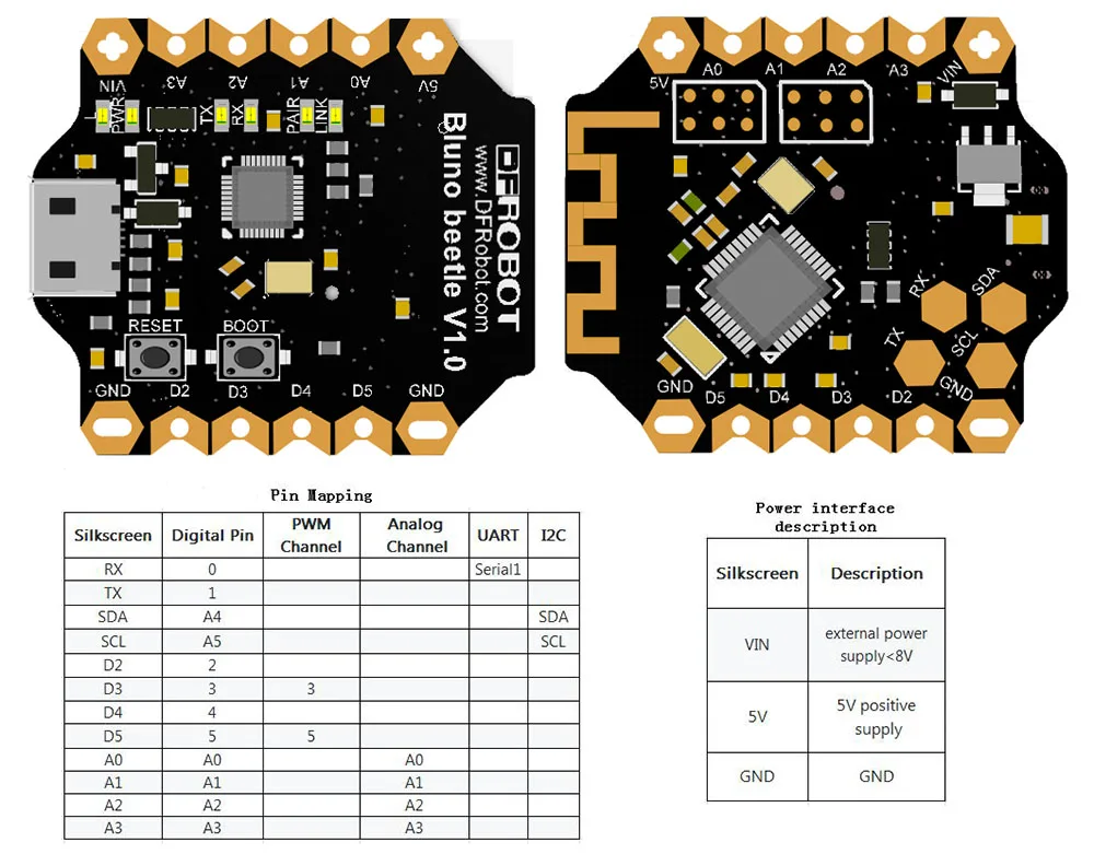 ATmega328 @ 16 МГц Bluetooth низкая энергия (BT 4,0) Порт Micro USB Супер компактный размер Поддержка Bluetooth HID и ibeacon Совместим со всеми сериями DFRobot bluo Поддержка беспроводного программирования