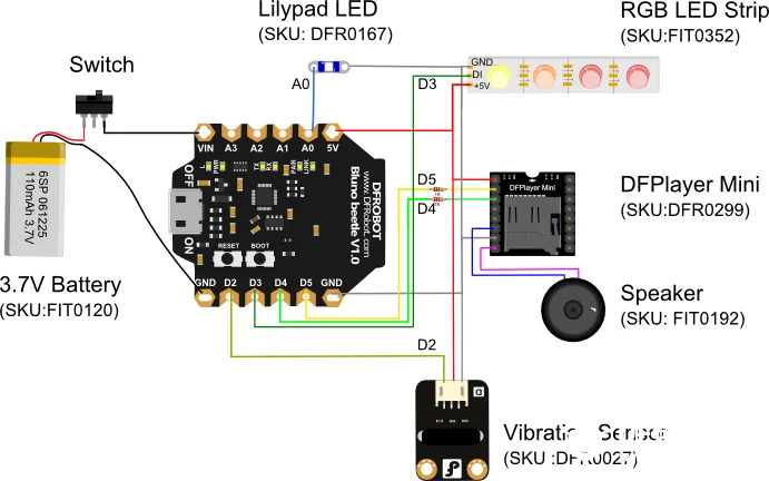 Проект 4: как сделать питомца пригодным для носки с жуком (Https://www.dfrobot.com/blog-541.html) Компоненты -Beetle BLE -Цифровая светодиодная лента RGB 60 светодиодов- (3 м) (защита от атмосферных воздействий) -LilyPad светодиодный Micro-белый (5 шт.) -DFPlayer-мини MP3-плеер для Arduino -3,7 V литий-ионный полимерный Батарея-1000 мА-ч -Динамик