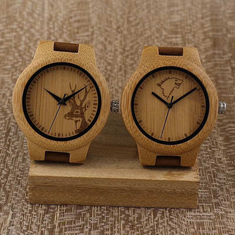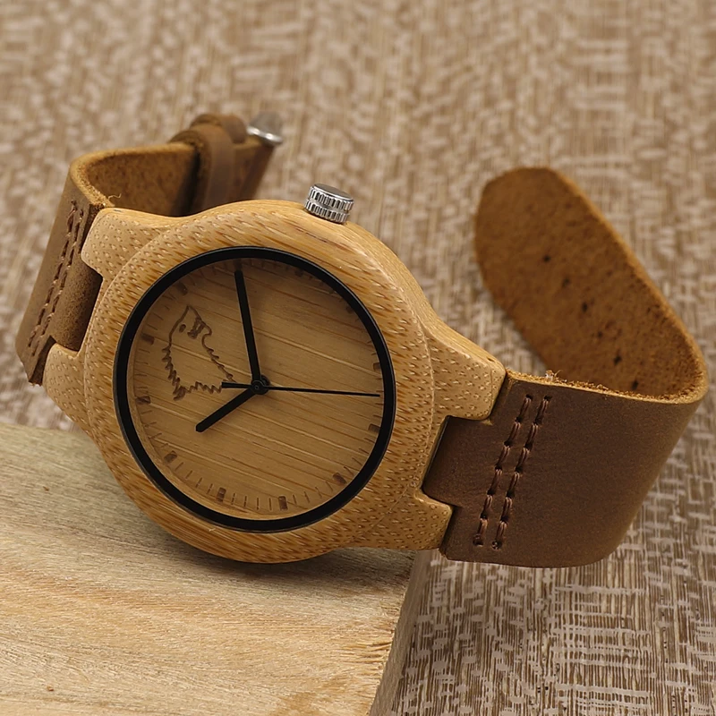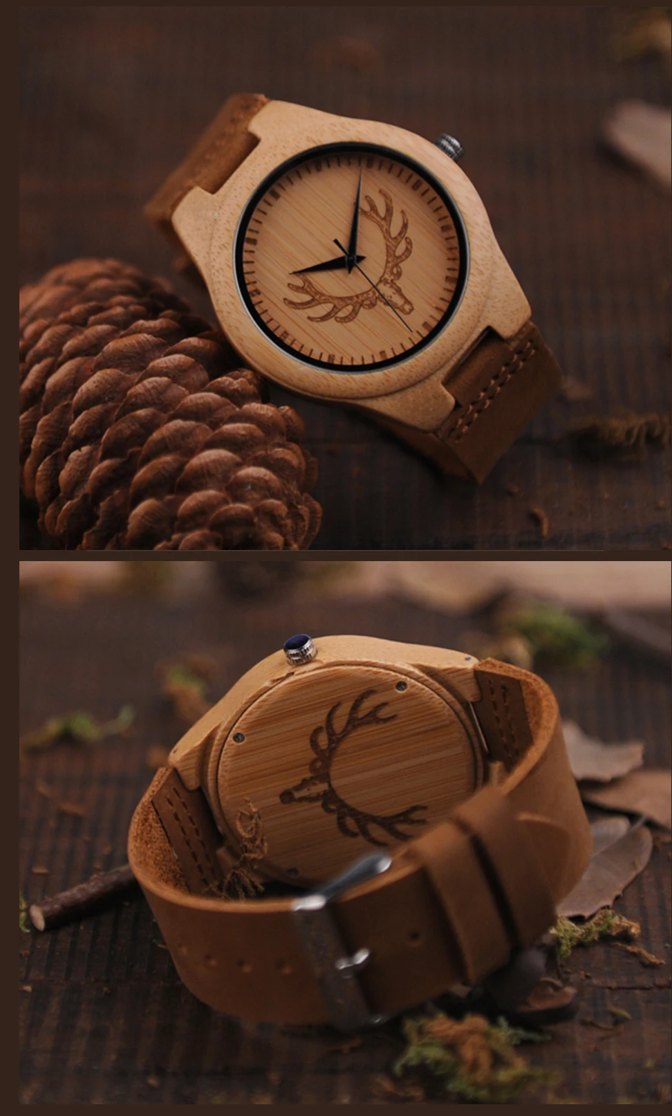 Мужские кварцевые часы с бамбуковым корпусом и ремешком из натуральной кожи