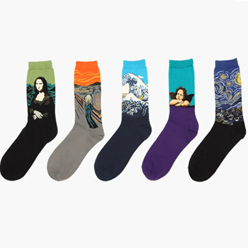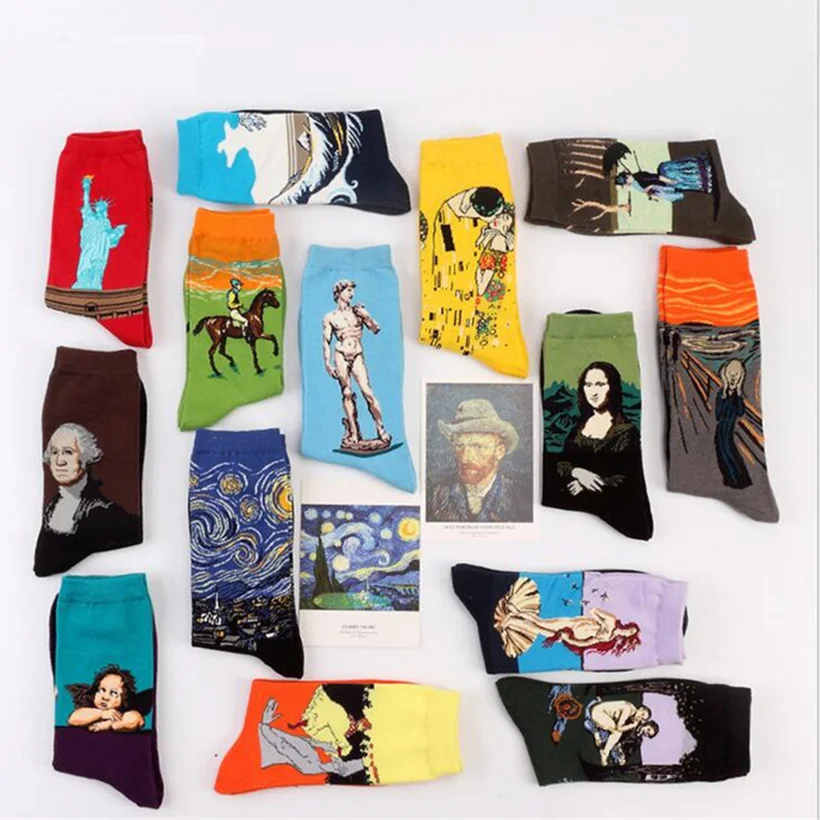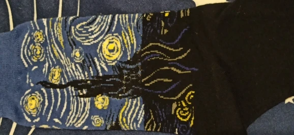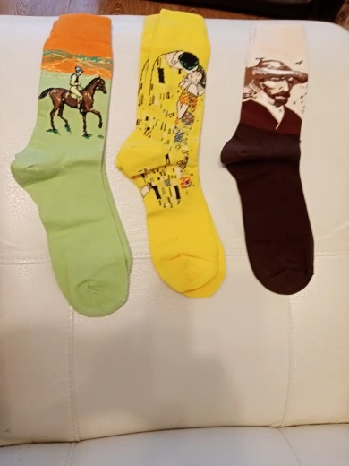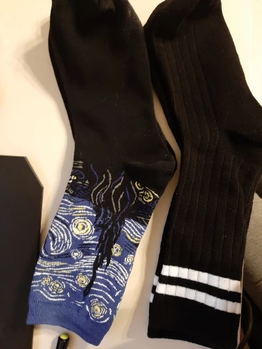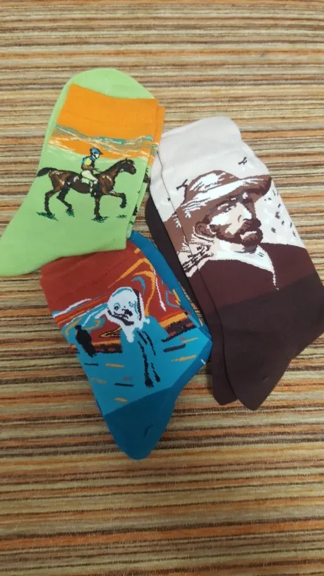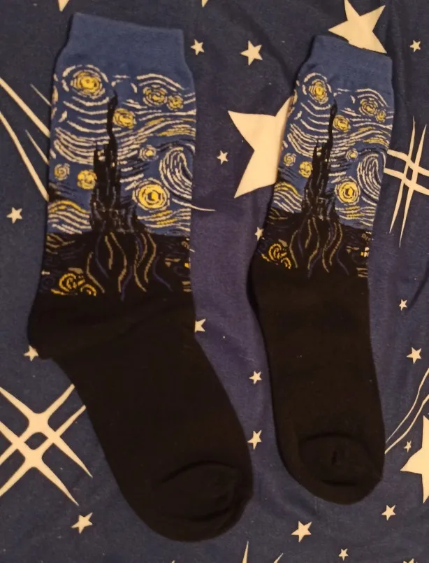 носки тёплые и точь в точь как на картинке, но очень большие и длинные. на ноге бедный Ван Гог немного плывёт...