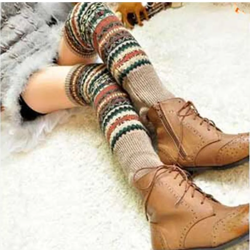 Женские носки для сапог до колена, богемные зимние вязаные гетры с принтом для женщин, хлопковые гетры контрастных цветов