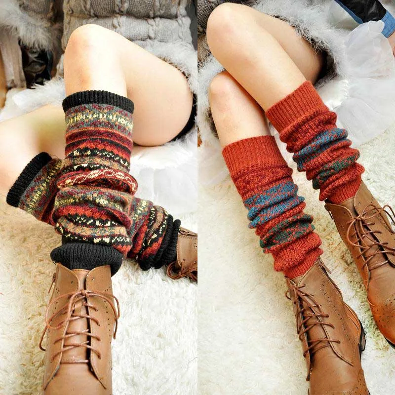 Носки женские до колена, зимние вязаные гетры с принтом в богемном стиле, хлопковые гетры контрастных цветов