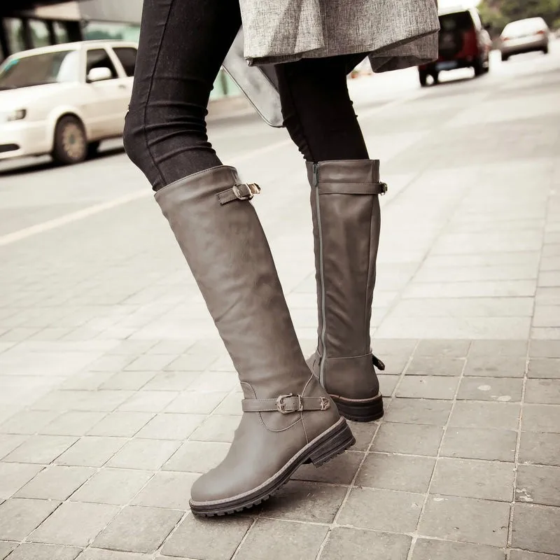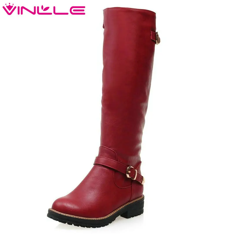VINLLEженские ботинки 2020 г. Зимняя обувь модные сапоги до колена с круглым носком Универсальная женская обувь из PU искусственной кожи на среднем каблуке черного, серого, красного цвета