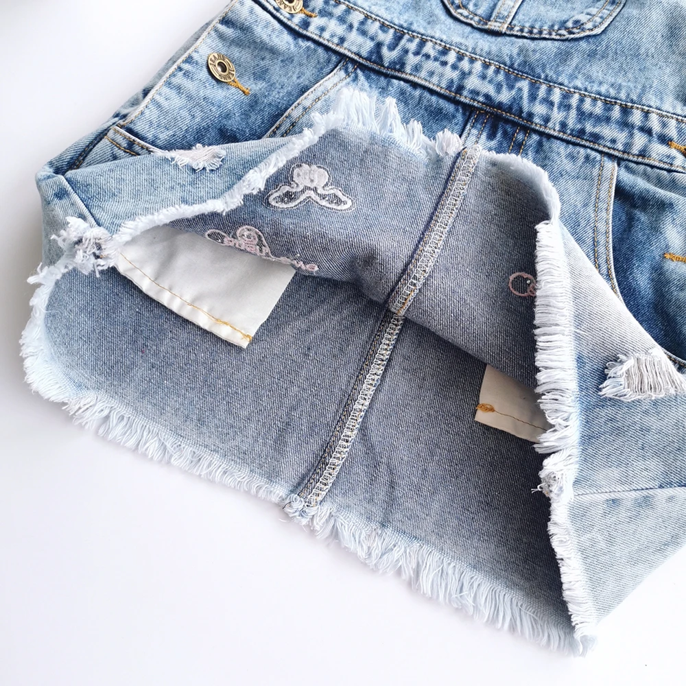Тонкая джинсовая тканьРазмер: 2-3 лет --- Общая длина: 50 см --- Талия: 30 см --- для роста около 98 см Размер: 3-4 лет --- Общая длина: 52 см --- Талия: 31 см --- для роста около 104 см Размер: 4-5 лет --- Общая длина: 55 см --- Талия: 32 см --- для роста около 110 см Размер: 5-6 лет --- Общая длина: 58 см --- Талия: 33 см --- для роста около 116 см Размер: 7-8 лет --- Общая длина: 60 см --- Талия: 34 см --- для роста около 128 см