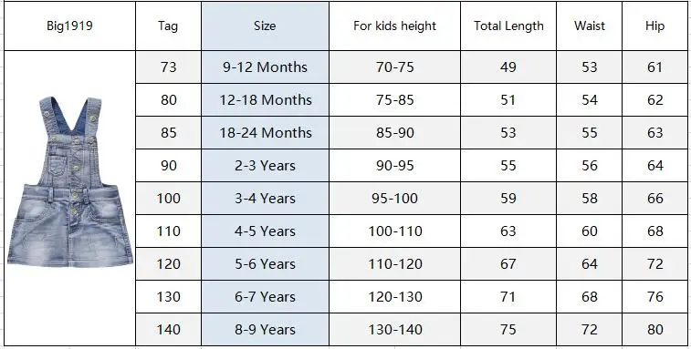 1. Тонкая джинсовая ткань2. Высококачественный хлопокРазмер 3-4 года ---- Длина: 54 см --- для детей ростом около 98-104 смРазмер 4-5 лет ---- длина: 59 см --- для детей ростом около 104-110 смРазмер 5-6 лет ---- Длина: 63 см --- для детей ростом около 10-116 см