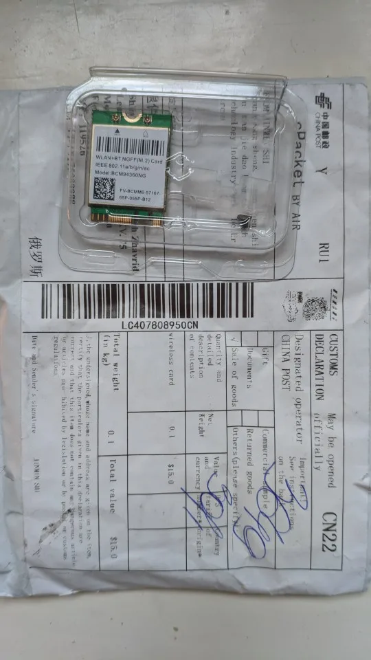 Доехало до СПб очень быстро - чуть больше 10 дней. Работает хорошо, как в Windows, так и в macOS, драйвера на Windows - есть на сайте Fenvi. Качеством доволен, работает без проблем. В комплекте отвертка, болтик и пластиковая "шторка", которая надевается поверх модуля и коннекторов антенн, чтобы не вылетали (как я понял, это частая проблема с этими модулями). У меня никаких проблем нет, но штуку эту закрепил на всякий случай. Если вдруг возникнут какие-то проблемы - дополню отзыв