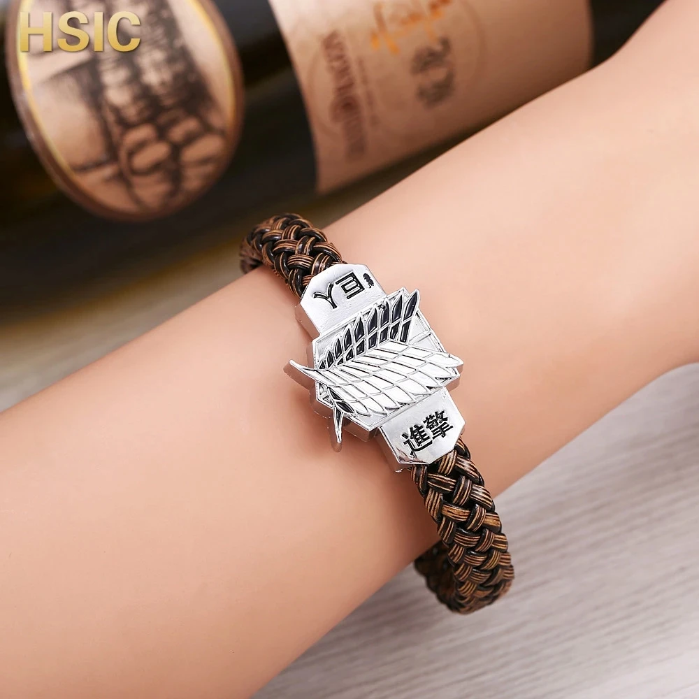 Плетеный кожаный браслет в стиле аниме атака на титановый браслет, мужской браслет с крыльями атаки, браслет на застежке, браслет на запястье Косплей-браслет
