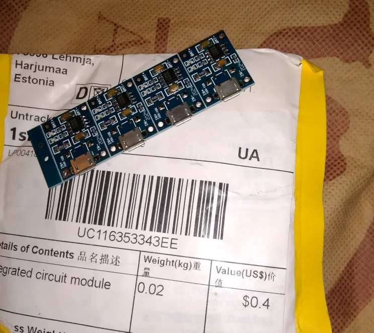 Страна: UA Color: Micro USB TP4056 Доставка: Cainiao Super Economy 25.01.2021