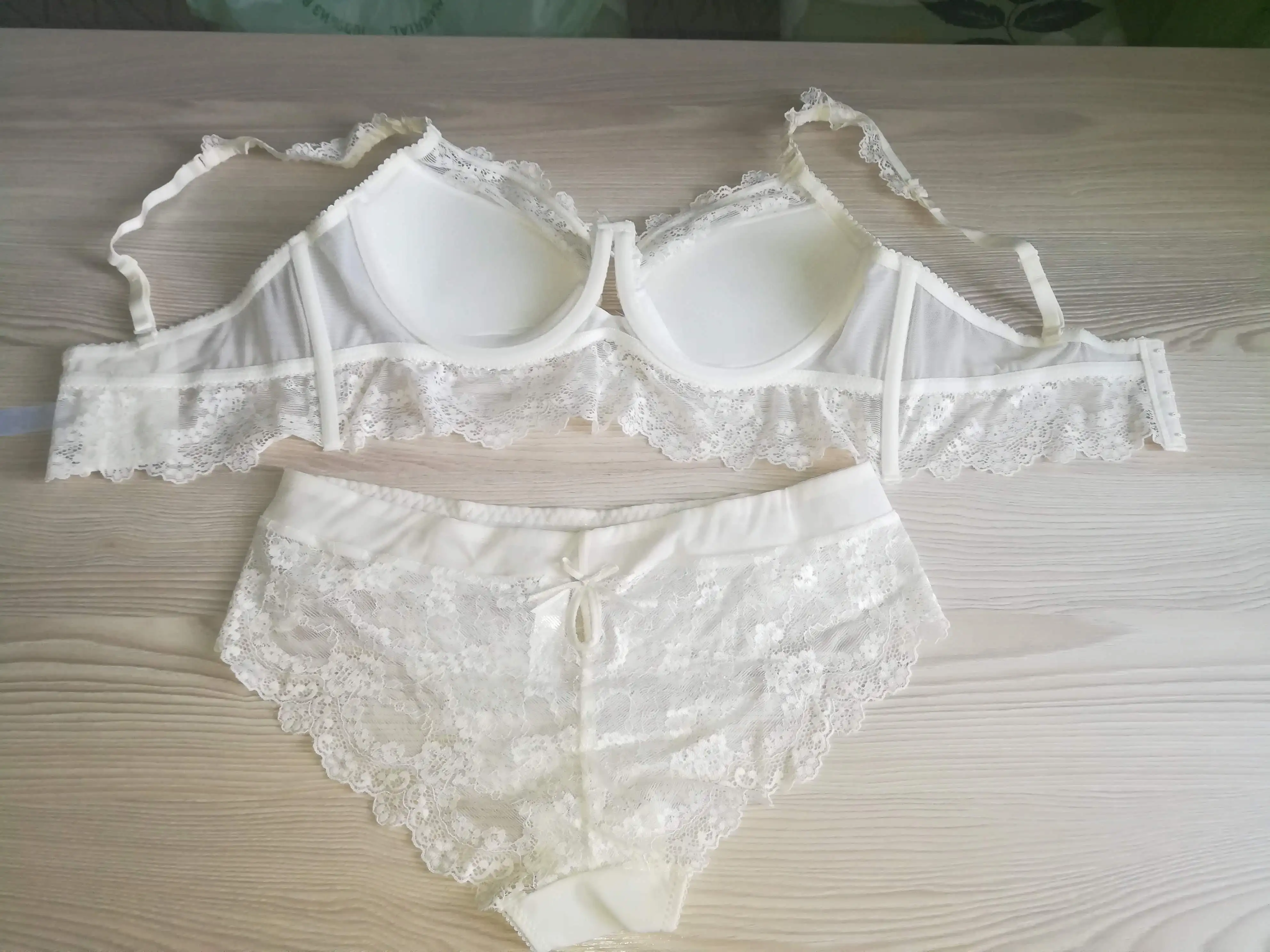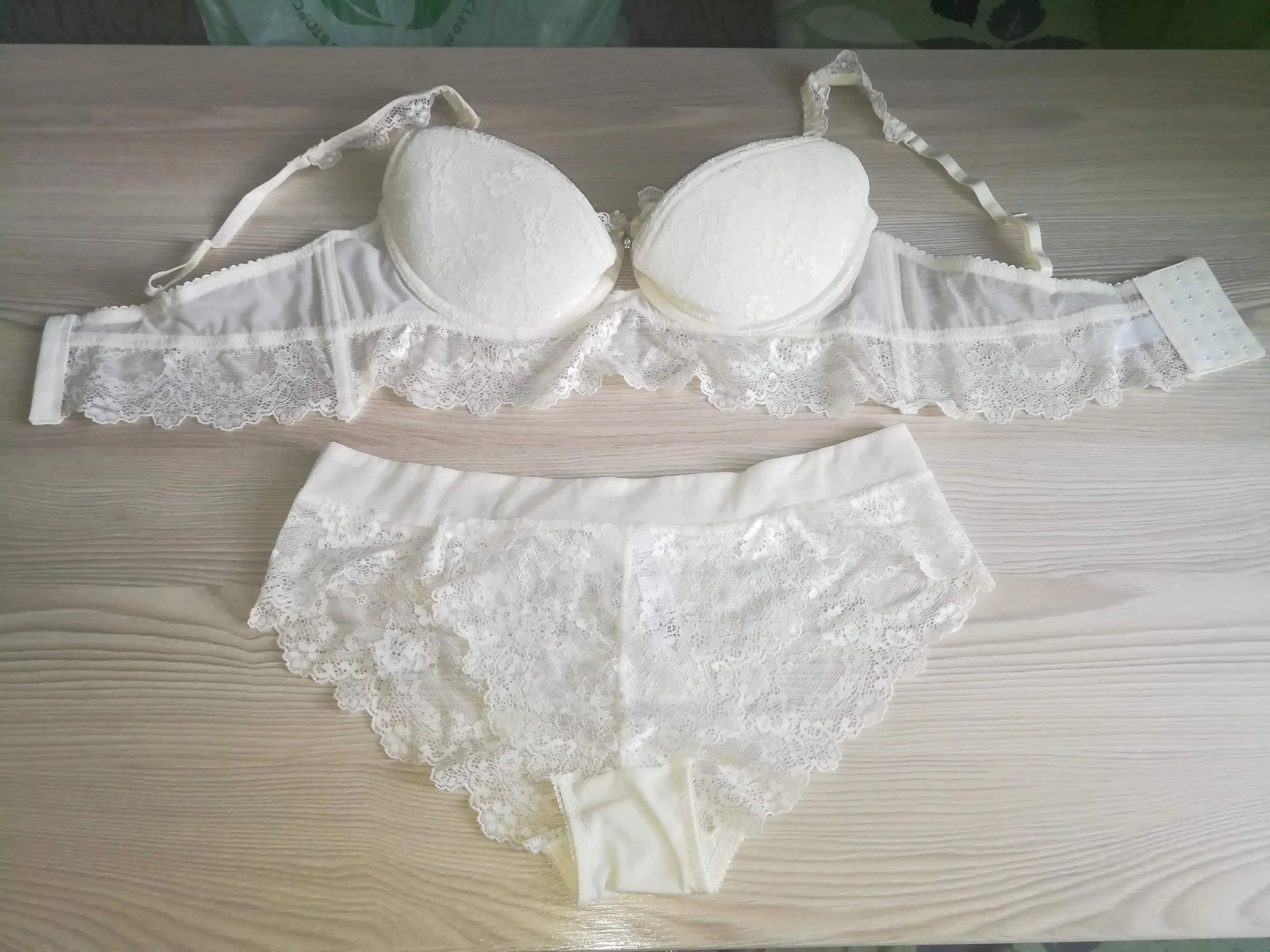 Уже не первый мой заказ у этого продавца, все было хорошо, и с размером и с бельем, получила этот комплект, разочаровалась..во первых цвет, он не белый-молочный, размер взяла как всегда, на мои параметры ОГ 95, ОПГ85 Б 102 - 85D...но он не понятно как сшит, по обьему хорошо, но полноты чашки нет, там поролон, и все это плоское..под мышками топорщится, вообщем н, от слова совсем, ходить в нем будет нельзя.Пробовала подтянуть лямки, лучше не стало. Трусики, попросила положить большего размера, продавец выполнил, за что огромное спасибо)е сидит Нежное кружево, широкая резинка, приятное к телу, прозрачные..