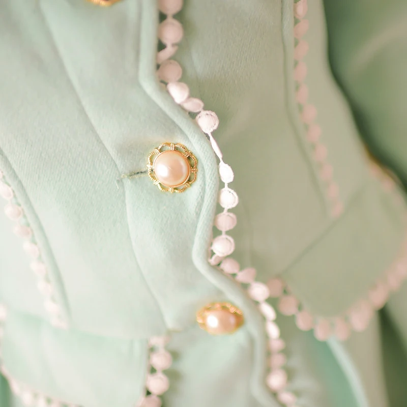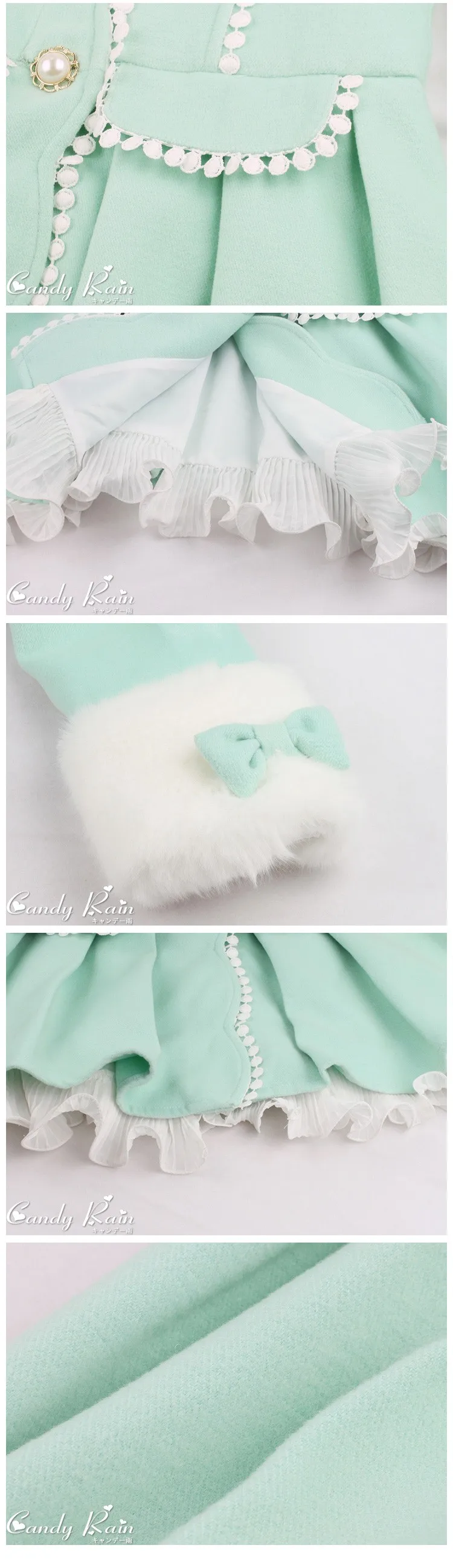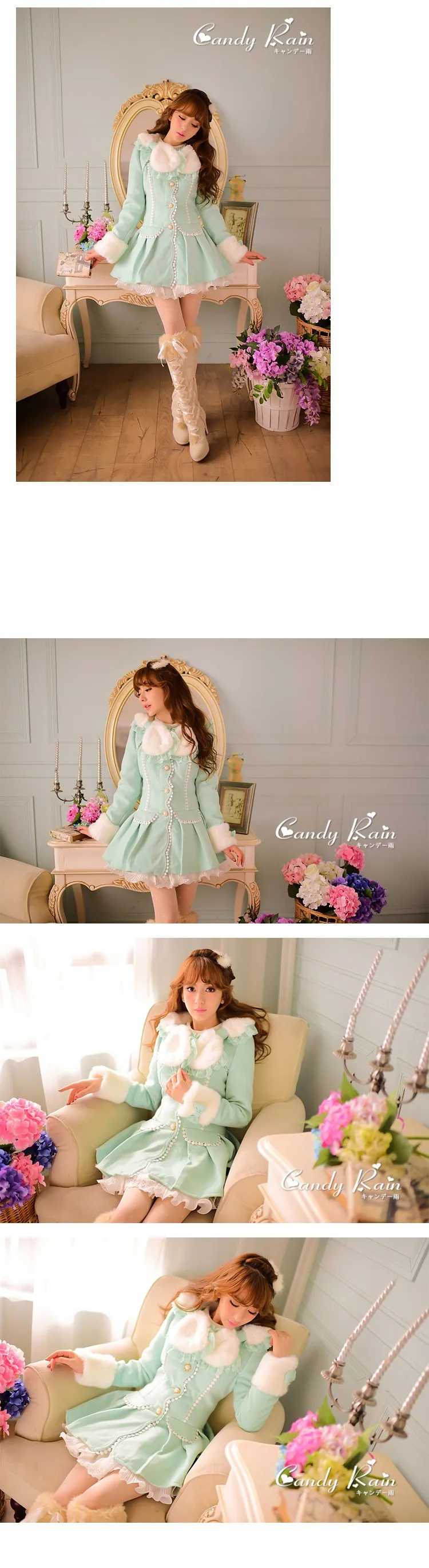 Милое пальто принцессы в стиле "Лолита", зимнее теплое пальто яркой расцветки из искусственного меха с бантом и кружевной мятно-зеленой волнистой каймой, шерстяное пальто C16CD5874