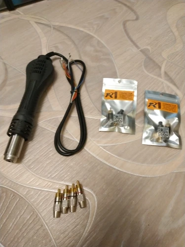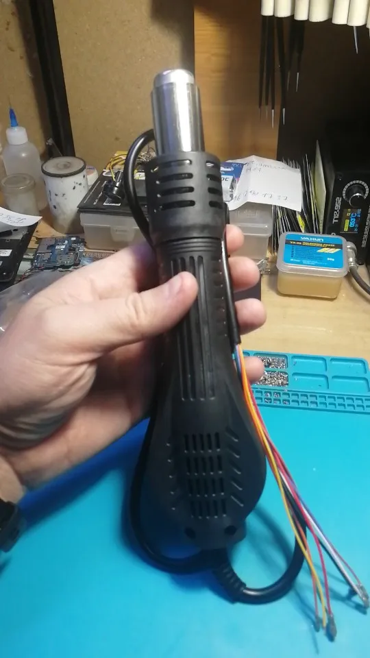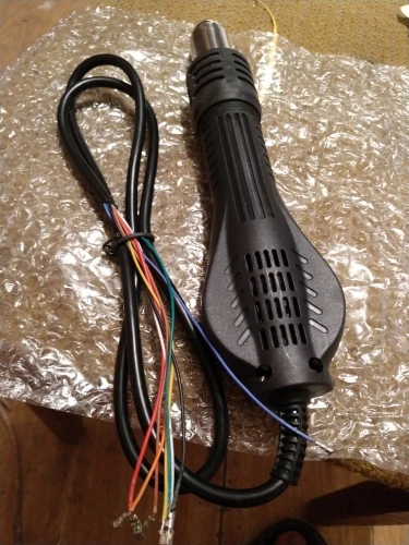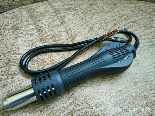 Покупал на замену воспламенившемуся фену станции Lukey 852D+fan. Обязательно сделайте кнопку выключения станции от сети!!! Иначе можно устроить пожар (если пробьёт симистор). Цвета проводов отличаются, прикрепил фото с распиновкой по цветам. Надеюсь будет полезно. качество сборки фена ужасное, провода переплетены, наконечники не обжаты, а припаяны.