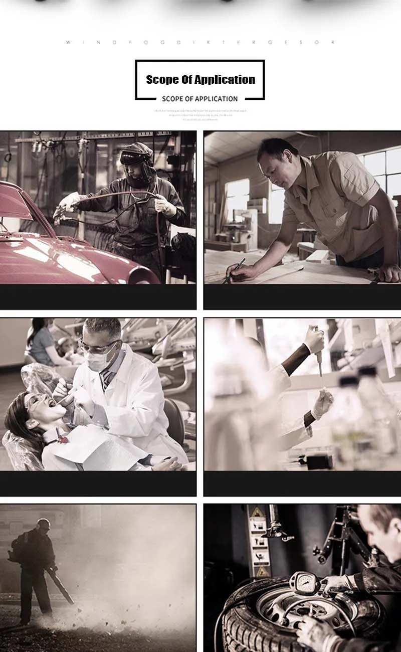 Преимущества:Супер тихий.Низкая вибрация.Чистый поток воздуха.Основные технологии.Модный и прочный дизайн.Безопасность использования.Простота в эксплуатации.Низкое энергопотребление.Высокоточная фильтрация.Внутри резервуара выполнена антикоррозийная обработка.Применение продукта:Промышленное производство, экспериментальный анализ, научные и коммуникационные технологии, нефтяная химическая промышленность, зеленая энергия, аэрокосмические технологии, полиграфия, красота, продукты питания, медицинские и все отрасли, которым нужен чистый воздух.