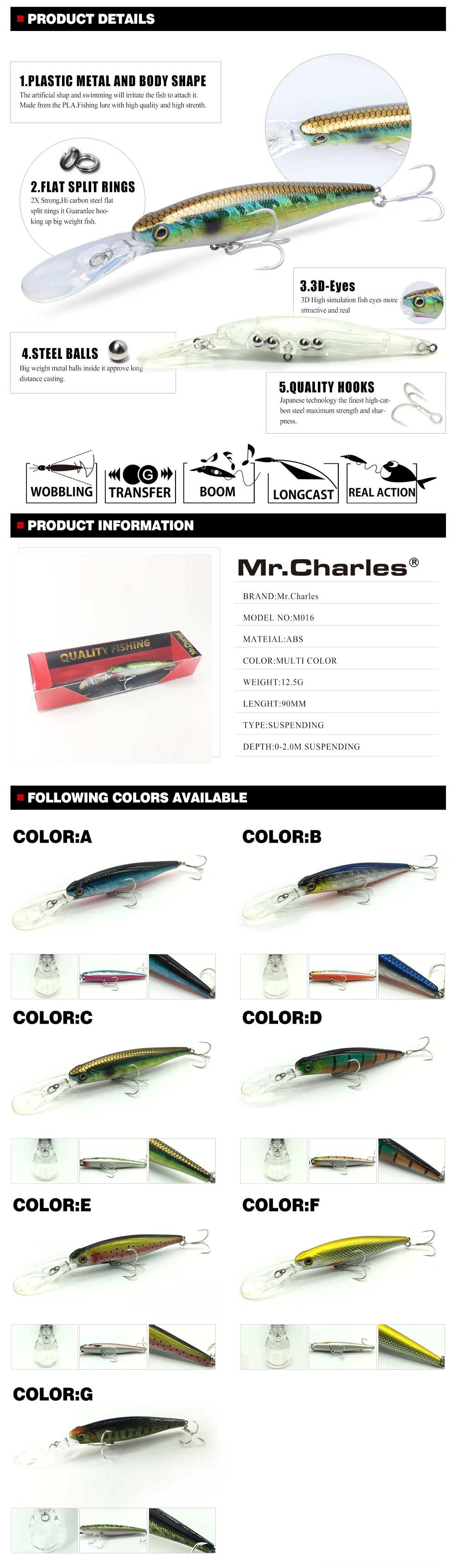 Приманка Mr.Charles CMC016, 90 мм, 12,5 г, 0-2,0 м, подвесная, жесткая, с объемными глазами
