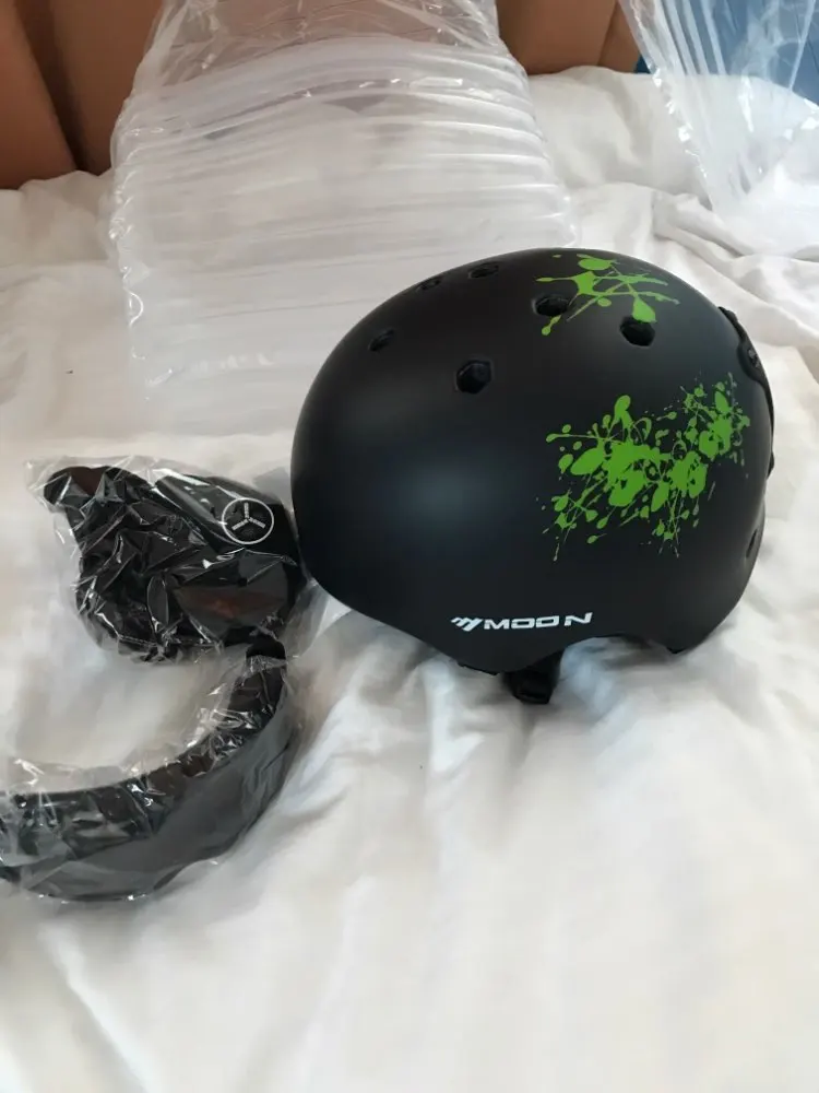 Шлем шел около месяца. Упакован хорошо. Но наша почта всё равно умудрилась его разхуячить. Прикольный яркий цвет, а по сути пенопласт облитый тонюсиньким слоем целлулоида. Ремни вделаны в пенопласт, без заклёпок. Создал спор, продавец принял и деньги вернули.
