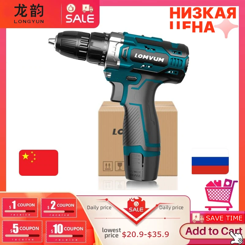 Аккумуляторная дрель-шуруповерт LOMVUM, 12 В, с регулируемой двухскоростной перезаряжаемой литиевой батареей