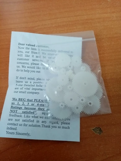 Очень быстрая доставка, около 15 дней. Хороший набор шестерёнок, практически на все случаи жизни.