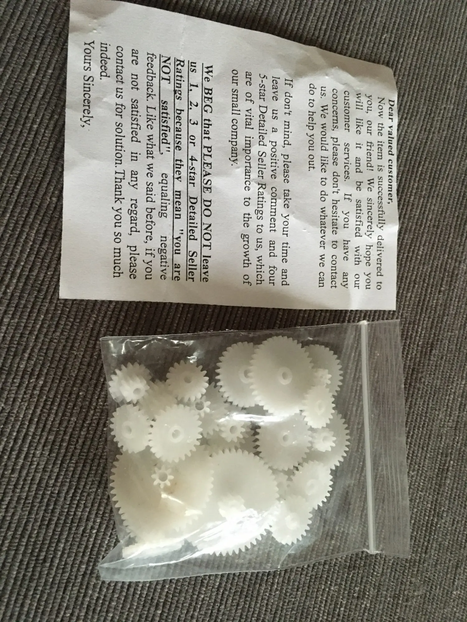 шестерни пришли целые, отслеживания никакого хотя когда я их покупала в доставке было написано что отслеживается, заказывала в ноябре 2020 пришли в январе 2021. и их сбросили в почтовый ящик.