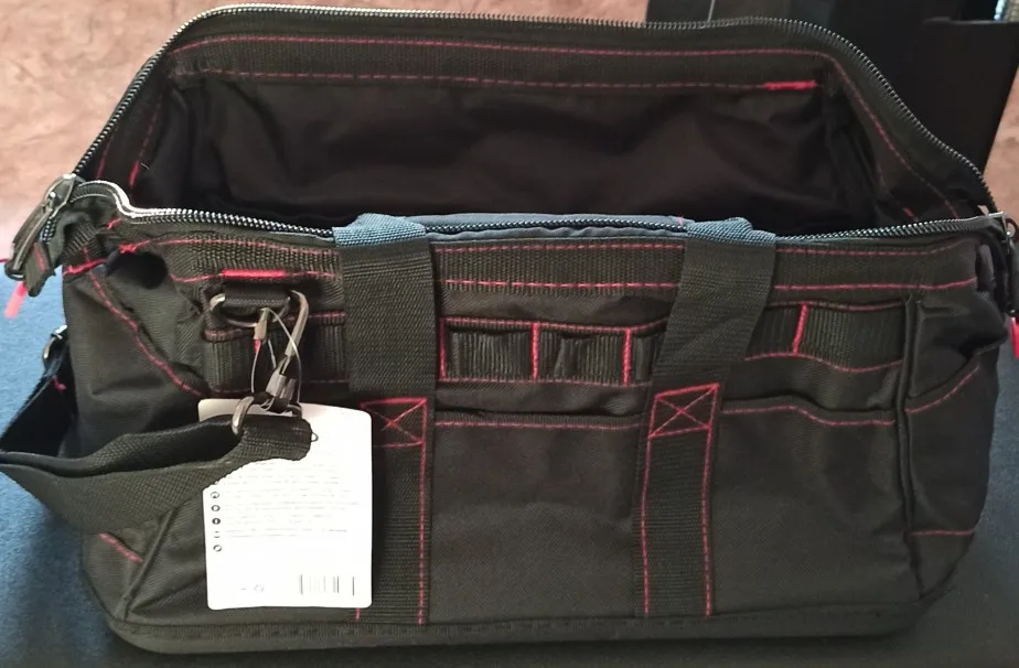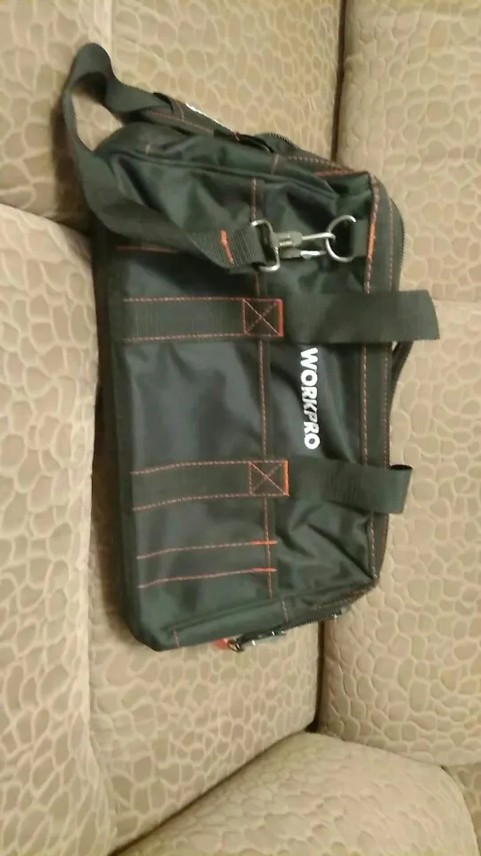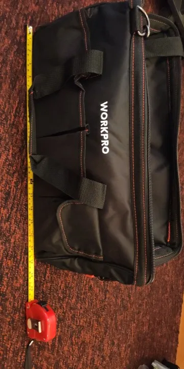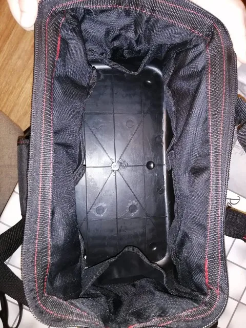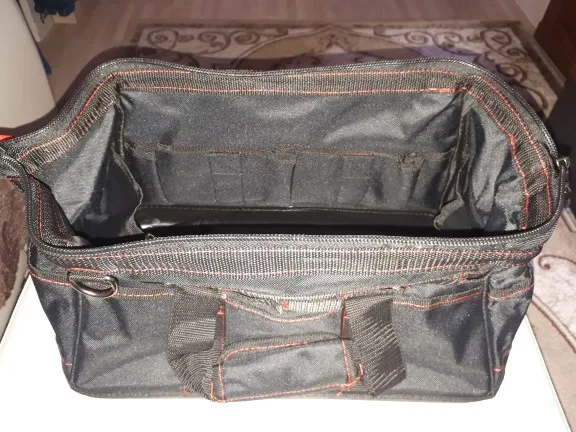 Отличная сумка для инструментов. Он кажется очень прочным, широким внутри, хотя кажется, что нет, боковые карманы очень полезны для ножниц, метра или чего-то еще. У основания есть резиновые ленты, чтобы она не потемнела и защищала дно. Он поставляется с отдельной ручкой и очень полезен для транспортировки так, как вы хотите. Это был подарок, и это был полный обман. Кроме того, он прибыл очень быстро, через 3 дня, отлично.