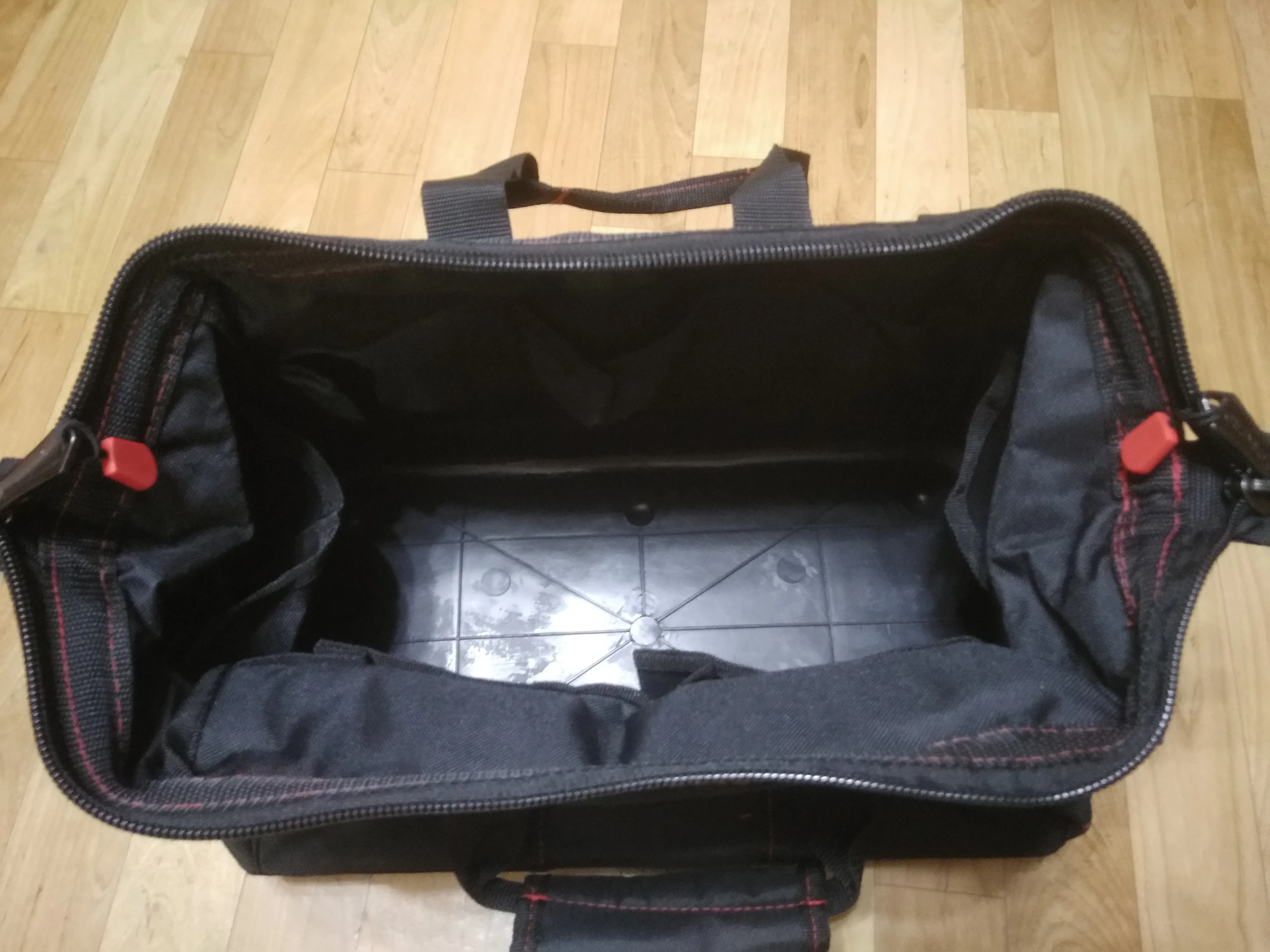 Рекордная доставка - 3 дня! Жёсткое дно, вшитый упругий металлический стержень около молнии. Крепления наплечного ременя сделаны качественно. Имеются боковые карманы. Качественная добротная вещь, брал под инструменты по электрике. Всем рекомендую этого продавца!