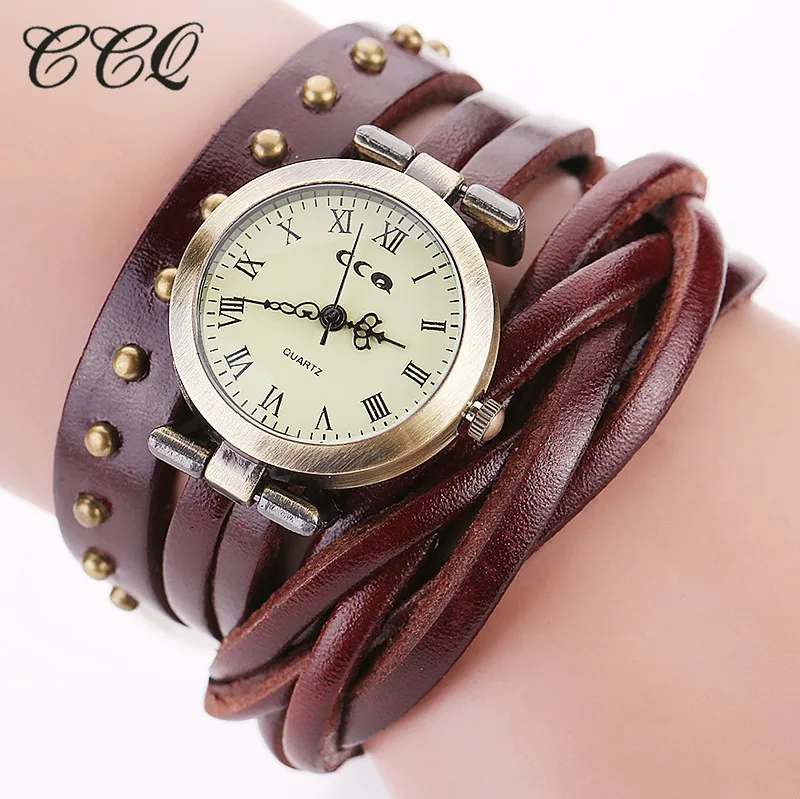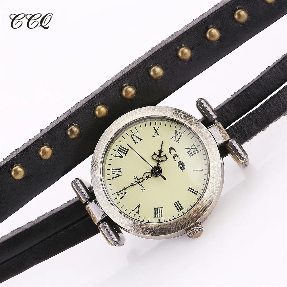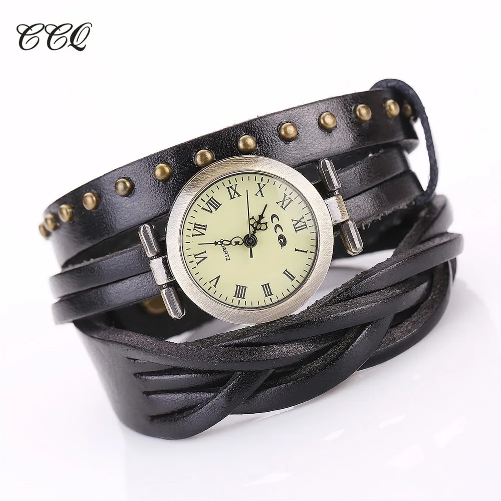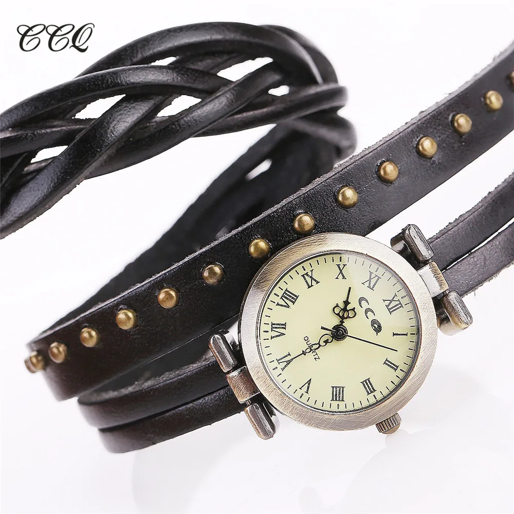 CCQ Марка Урожай Ретро Заклепки Плетеный Кожаный Браслет Женщины Наручные Часы Мода Кварцевые Часы Relogio Feminino Подарков 681