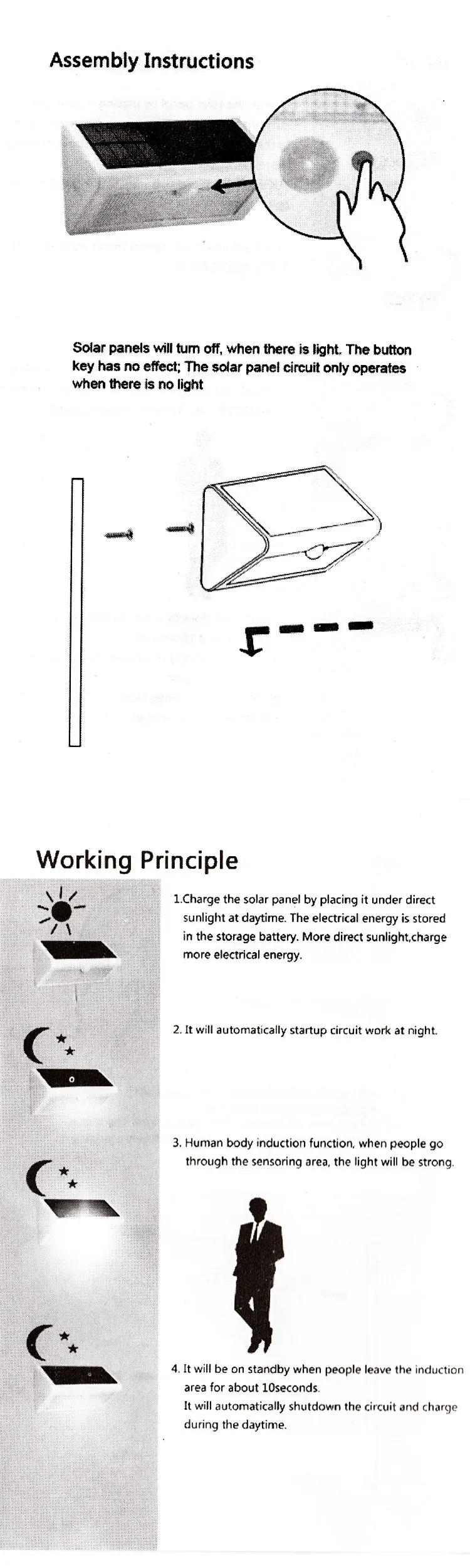 Особенности: Солнечная панель:5,5 V, 2,5 W 450MA Литий-ионный аккумулятор:3,7 V,4400MA, Режим:Выкл/тусклый/высокийПереключатель внутри для экономии энергии во время отгрузки Светодиодный источник:38 * Светодиодный Люмен:600 люменов Светодиодный срок службы:50000 часов Время зарядки на солнечной батарее:8 часов Режим освещения:Активация движения для освещения ночьюАвтоматическое определение дня или ночи Характеристики безопасности:Над зарядкой, над разрядкой, над током, короткого замыкания Срок службы литий-ионного аккумулятора:500 кругов Срок службы солнечной панели:Более 5 лет