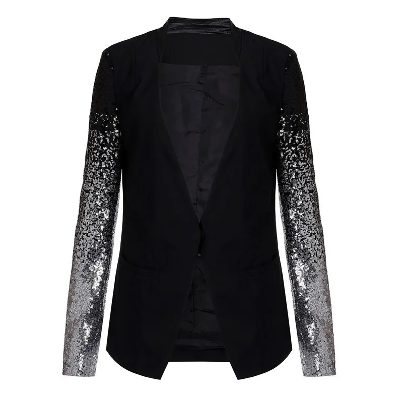 Женский блейзер с блестками, блейзер с длинным рукавом и лацканами, серебристый, черный, весна-осень 2015