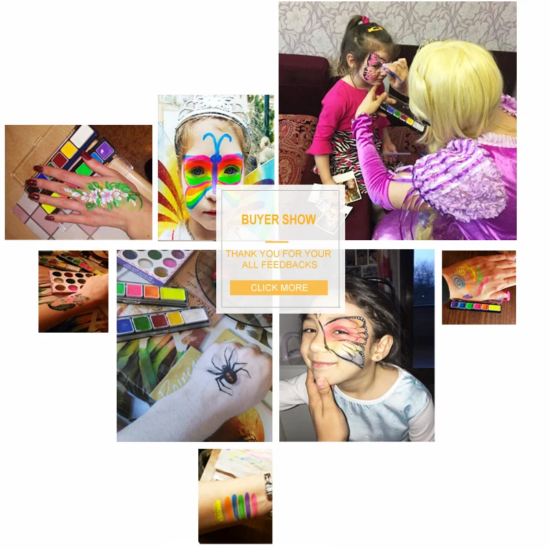 Как использовать:Окуните кисти и губки в воду, затем используйте влажные кисти и губки, чтобы получить краски, а затем покрасьте на лице и теле.