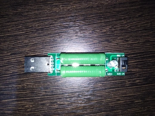 обычный нагрузочный резистор. имеет переключатель на 2 положения - первое 1А, горит зелёный светодиод, второе 2А, горит красный светодиод. даже на 1А резистор нагревается больше 100°С