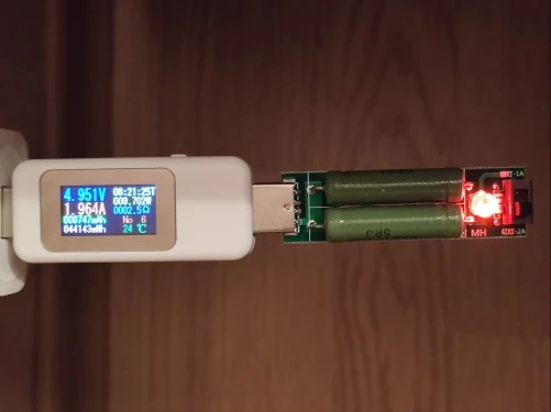 как многие писали, нагрузка весьма приблизительная. 0.8 и 1.7 получилось. горит либо зелёный либо красный светодиод. при "двухамперном" режиме сильно греется. дольше пяти секунд я бы под питанием его не держал. доставка чайнасуперэконом долгая и неотслеживаемая. упаковано было только в антистатический пакетик. Эта штука полезна, помогает узнать что неисправно: зарядка, или гнездо телефона. ну и полтинник самая цена за такое качество.