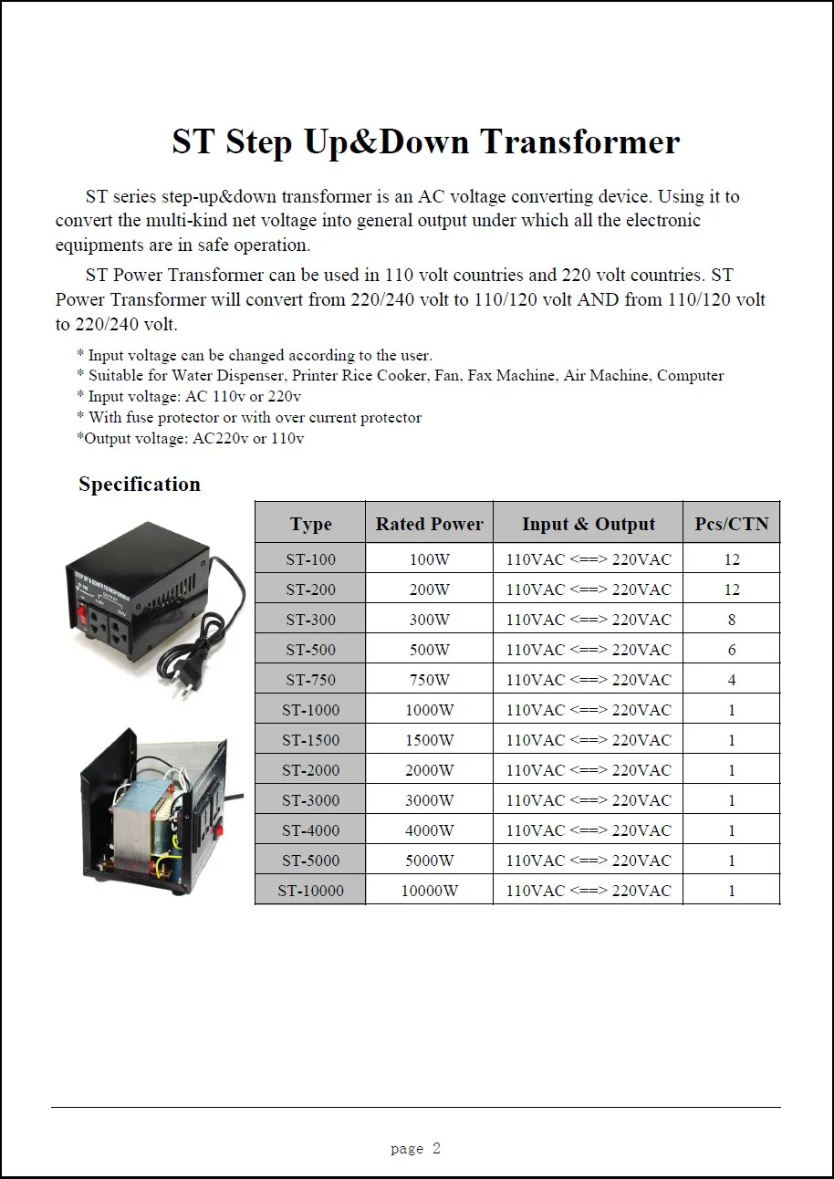800 Вт домашнего использования 220v-110v,110v-220v Шаг вверх и вниз трансформаторПонижающий трансформатор серии ST-устройство преобразования напряжения переменного тока. Используйте его для преобразования многократного сетевого напряжения в общий выход, при котором все электронные оборудования находятся в безопасной эксплуатации.Силовой трансформатор ST может использоваться в странах 110 вольт и 220 вольт. Трансформатор питания ST преобразует от 220/240 вольт до 110/120 вольт и от 110/120 вольт до 220/240 вольт.* Входное напряжение может быть изменено в соответствии с пользователем.* Подходит для диспенсера воды, рисоварки принтера, вентилятора, факсимильной аппаратуры, воздушного аппарата, компьютера* Входное напряжение: 110 В переменного тока или 220 В* С предохранителем или с защитой от перегрузки по току* Выход напряжение: AC220v или 110v