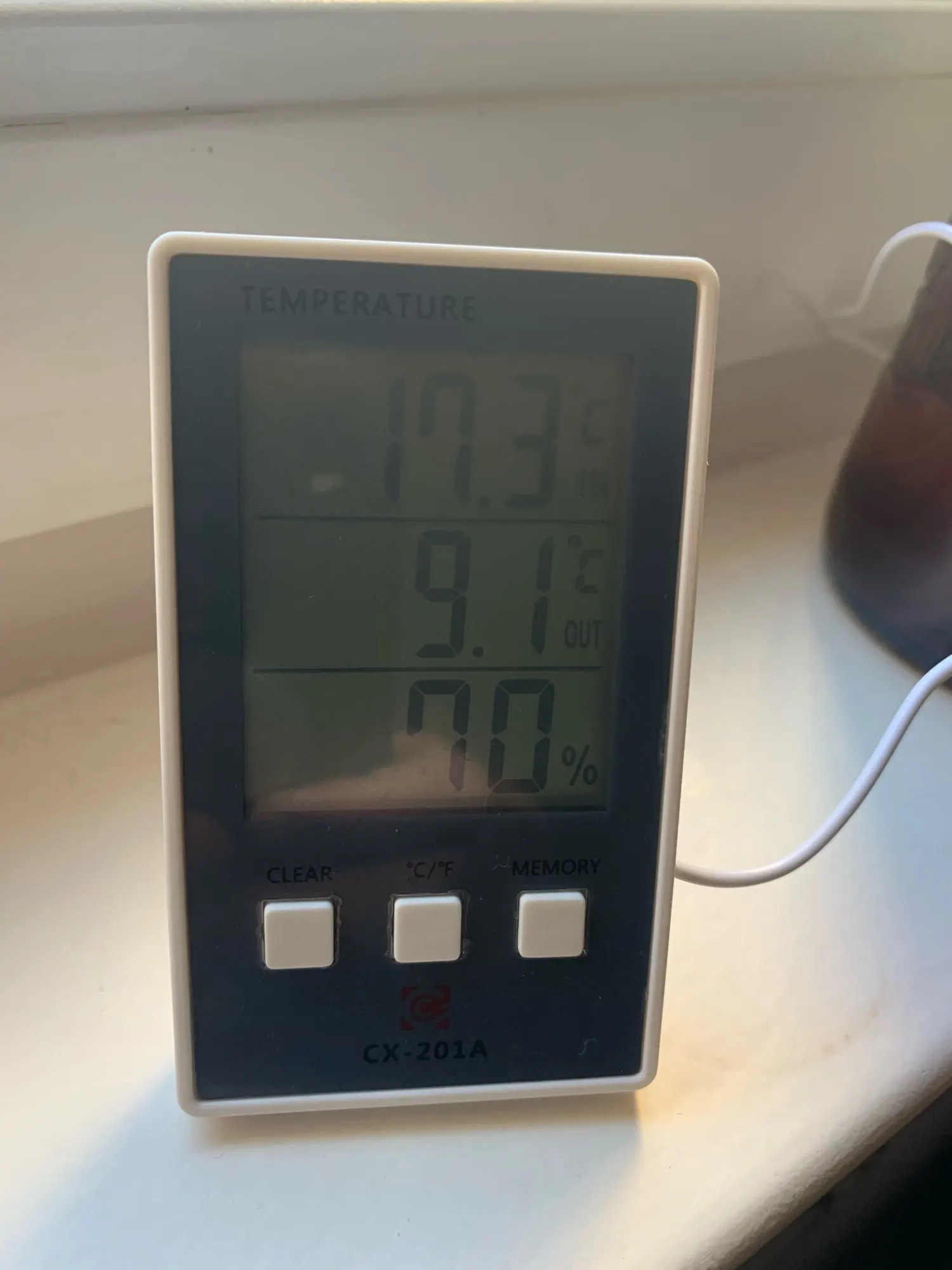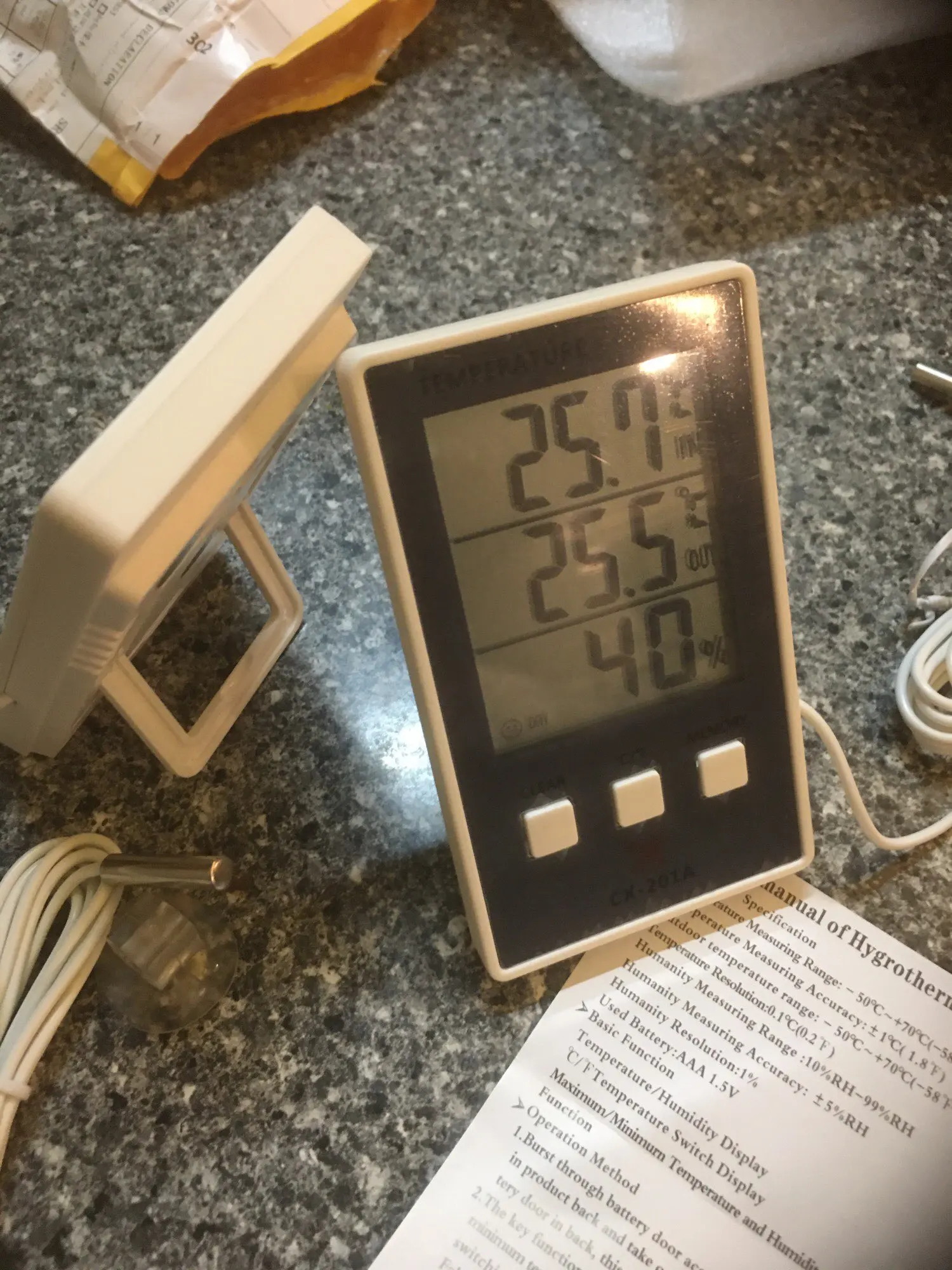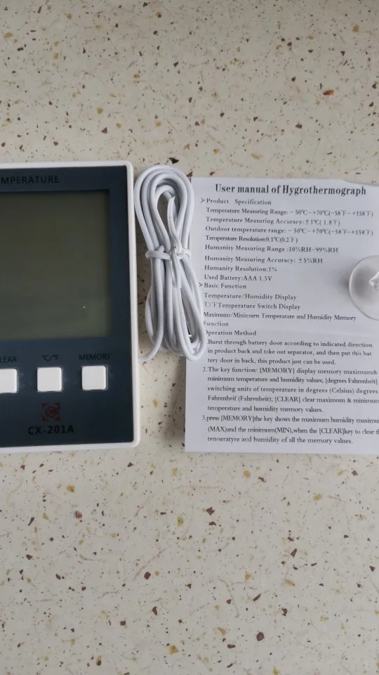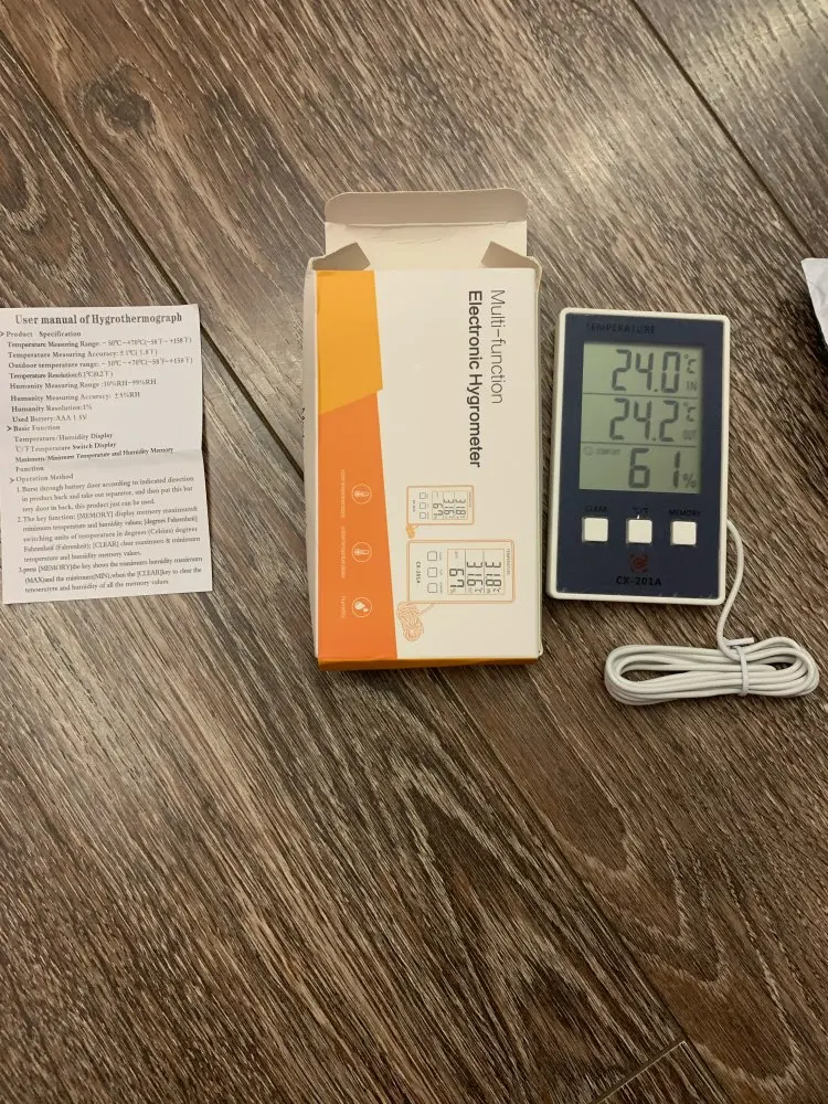 Recibido en España en menos de tres semanas. Bien embalado. El producto se corresponde con la descripción. Muy práctico para quien solo necesita datos de temperatura y humedad. Solo lleva una pila de 1,5 AAA (LR03) y el cable de la sonda exterior mide 1,5 m. Muy fácil de usar. Registra máximas y mínimas de las tres medidas. Satisfecho.