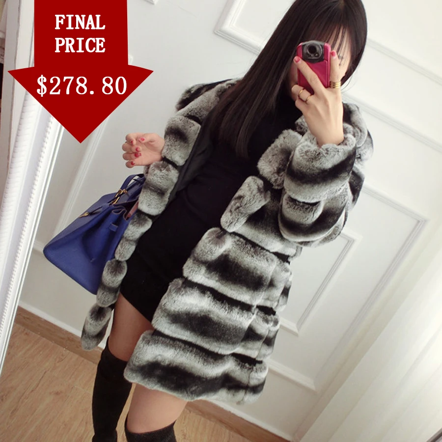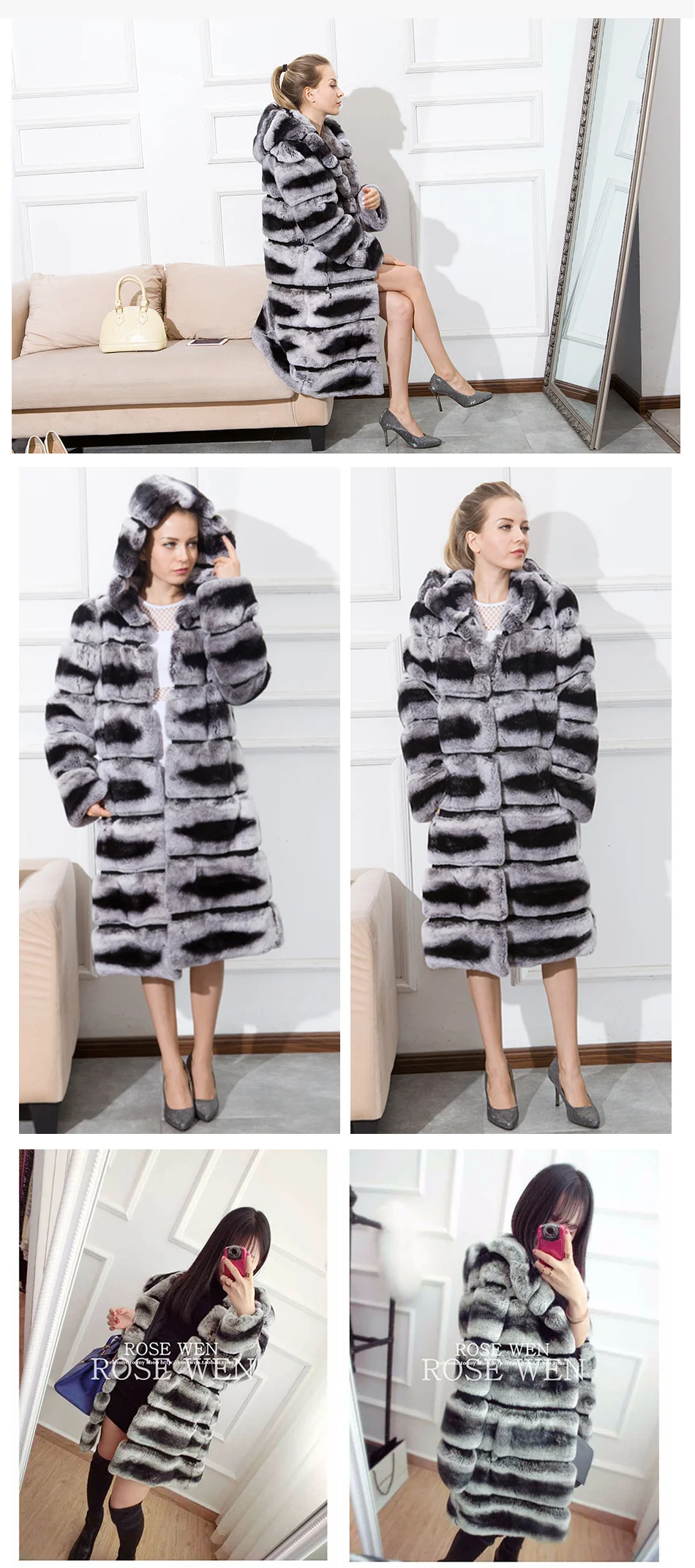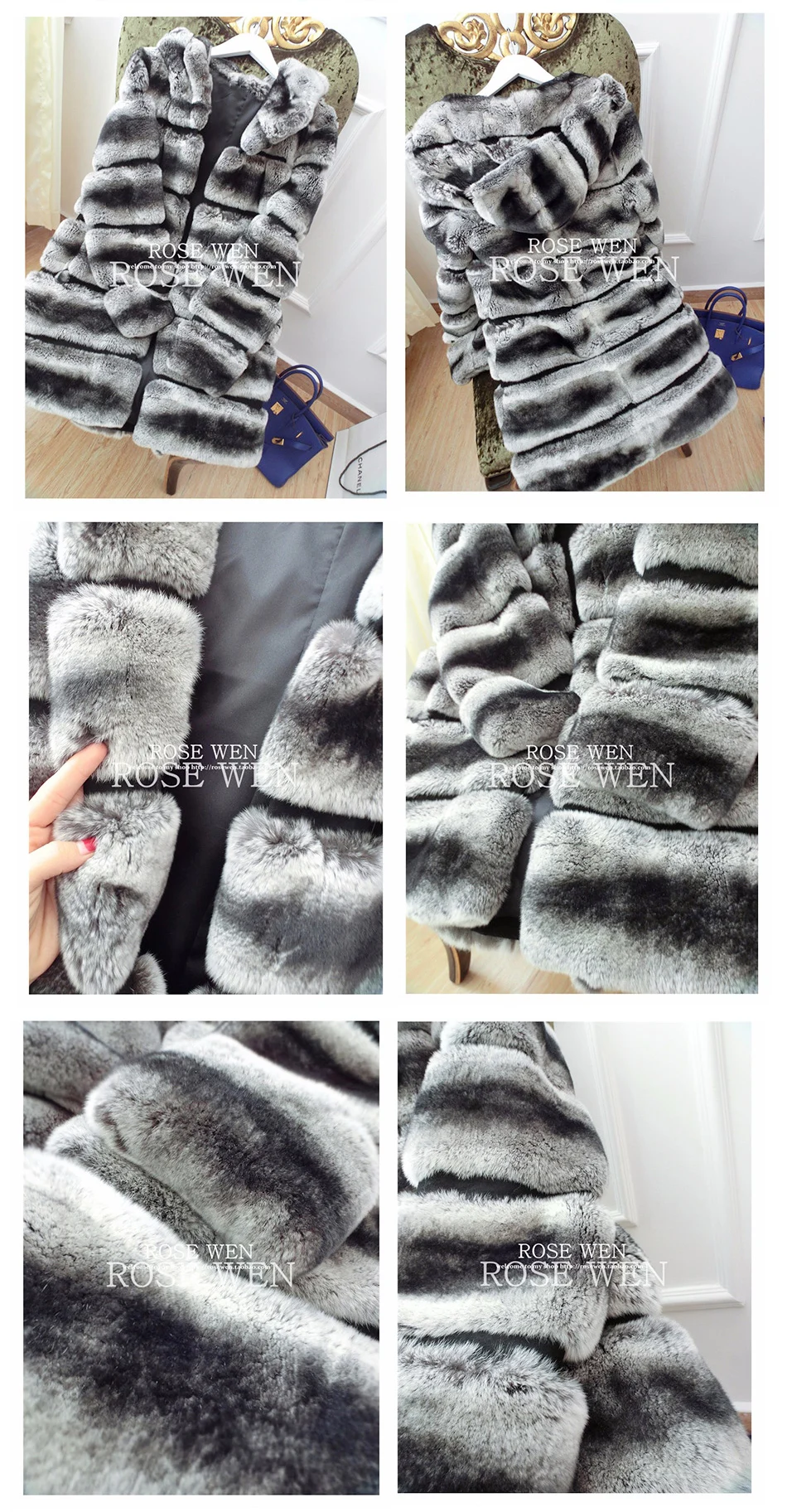 Высокое качество роскошные рекс кролика шуба шиншилла с капюшоном натуральный мех женщины Женские шубы из кролика шиншиллы длинные меховое пальто