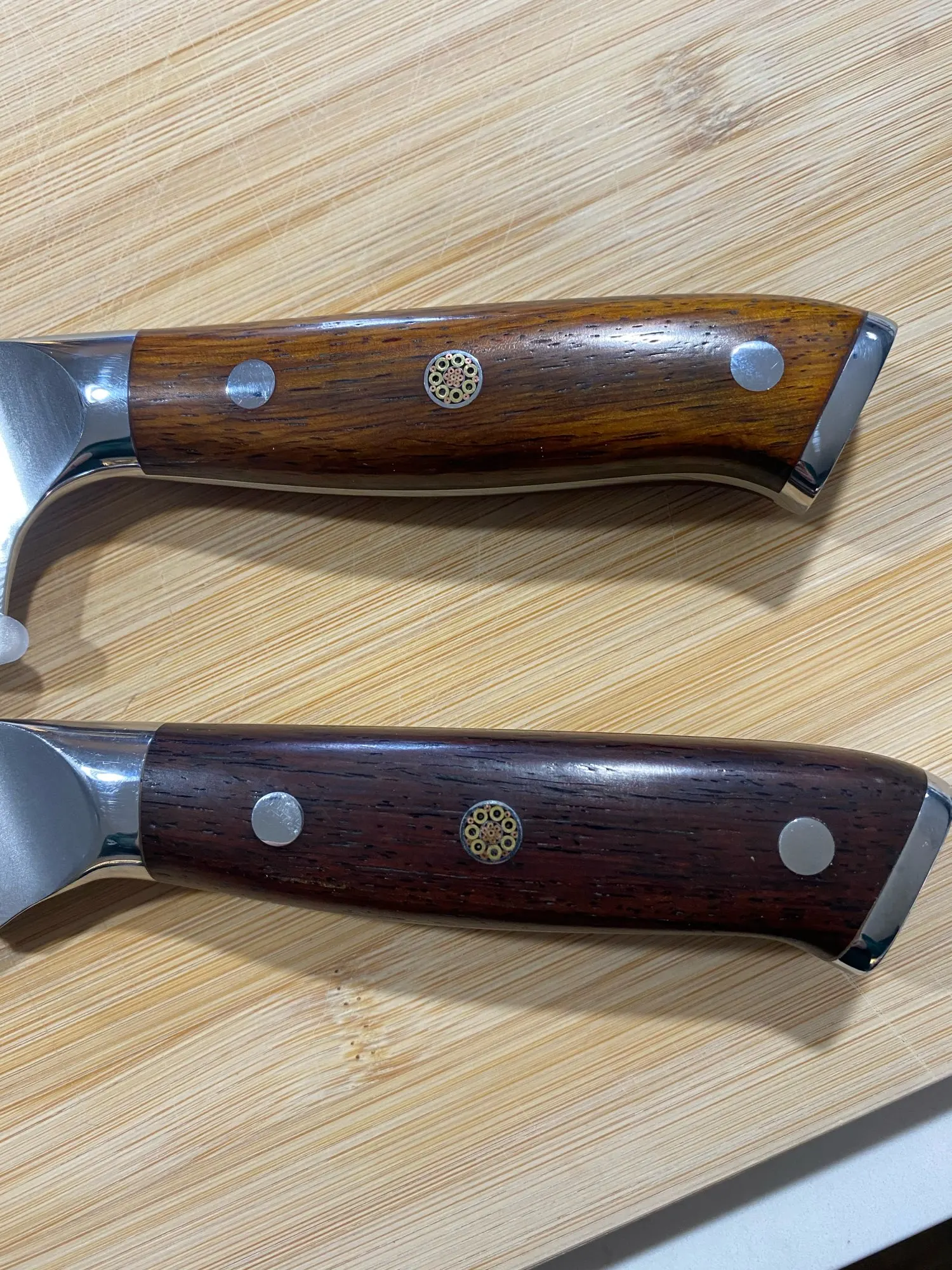 Эти ножи красивые и супер острые Теперь я владею 3 из них. 9 ”хлеб, 8” шеф-повара и 7 ”сантоку. Я настоятельно рекомендую эти ножи. Одна вещь, которую нужно запомните, это купить в качестве комплекта! Я получил свой нож для хлеба около 3 месяцев, прежде чем покупать остальные. К сожалению, у меня нет подходящих ручек.