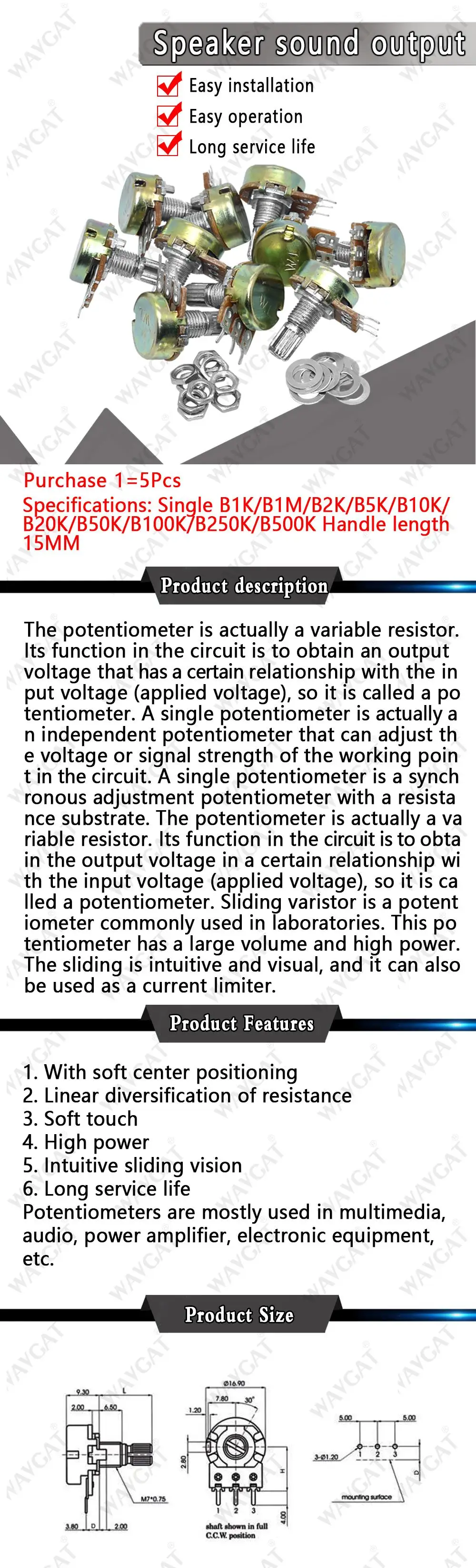 Линейный потенциометр WH148, 10 шт., линейный потенциометр B1K, B2K, B5K, B10K, B20K, B50K, B100K, B250K, B500K, B1M, вал 15 мм, с гайками, шайбы, 3pin, WH148