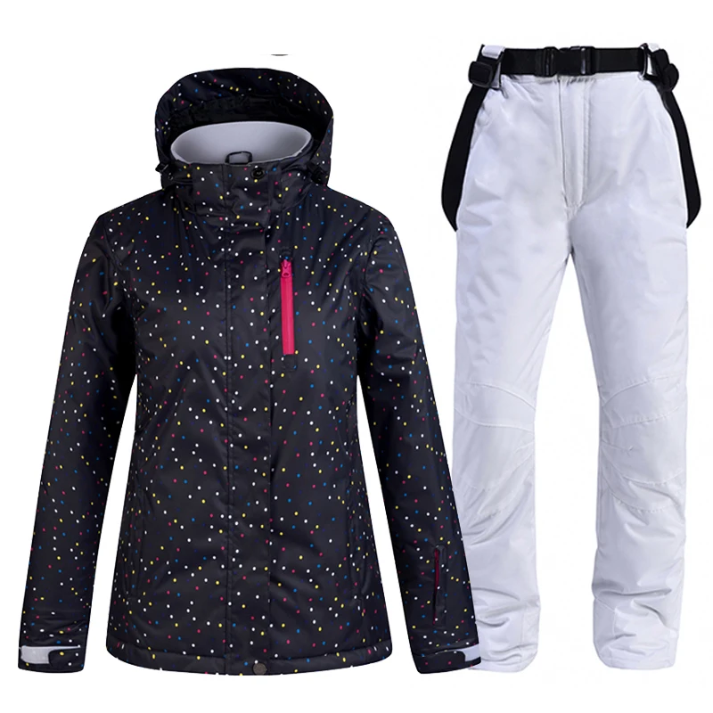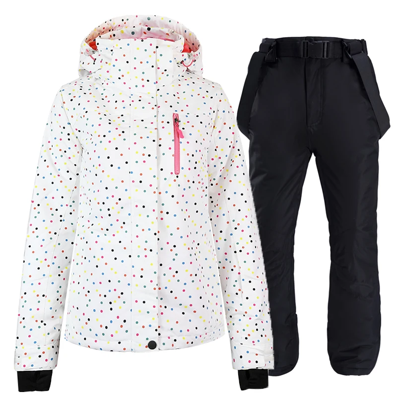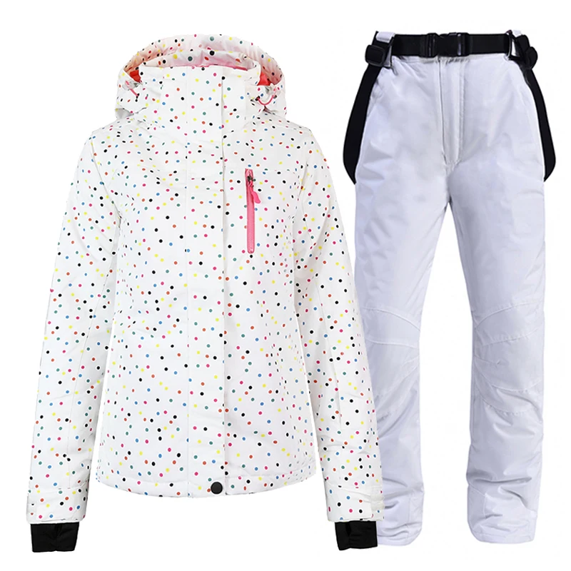 Белый женский зимний костюм для снега, одежда для сноуборда, водонепроницаемый Зимний женский лыжный костюм, куртка + брюки на бретелях для девочек