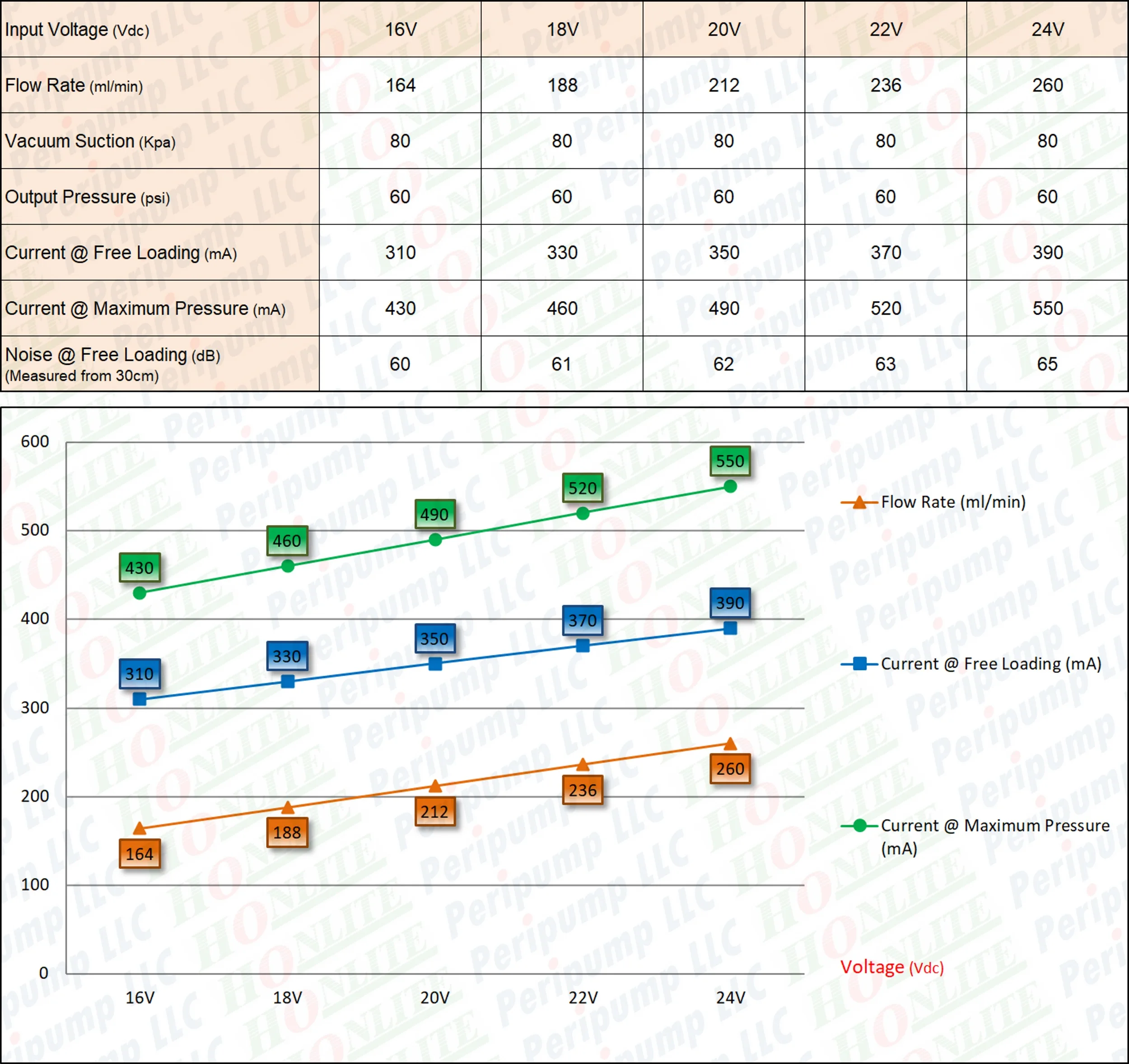 Скорость потока определялась водой. В случае, если вы намереваетесь использовать этот насос для управления жидкостью с вязкостью, тогда расход будет импульсирован. Чем выше вязкость жидкости, тем ниже будет расход. В худшем случае насос может вообще не управлять жидкостью.