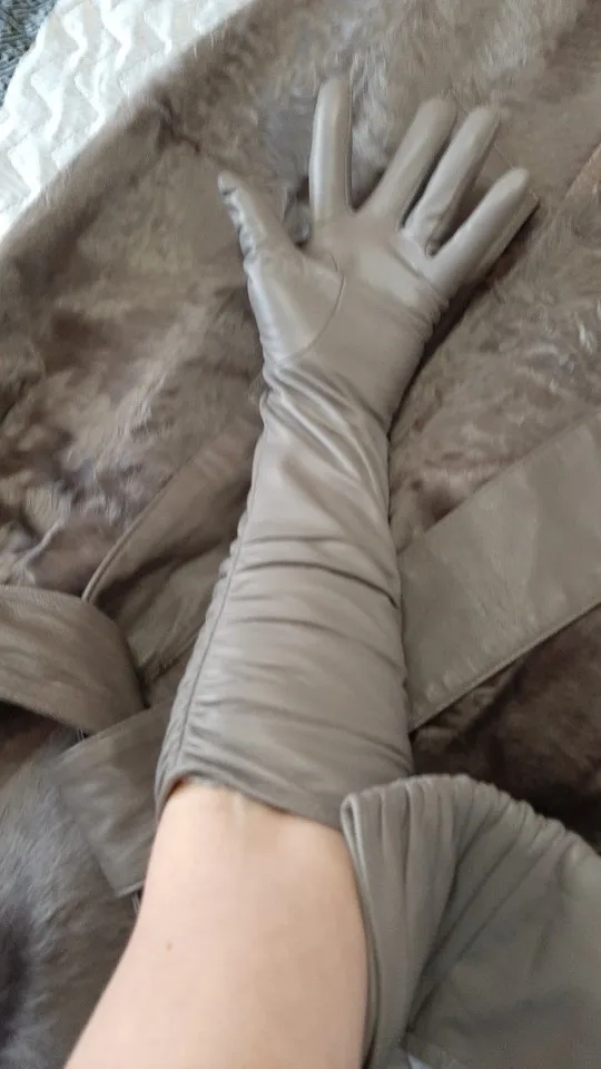 Не совсем пойму натуральная ли кожа,написано кода козлик,очень тонкая,мягкая, взяла 7 1/2 подошло,плотно сели,внутри мягкий пушистый подклад, длина почти до локтя. Идеально подошли к пальто из стриженого козлика.