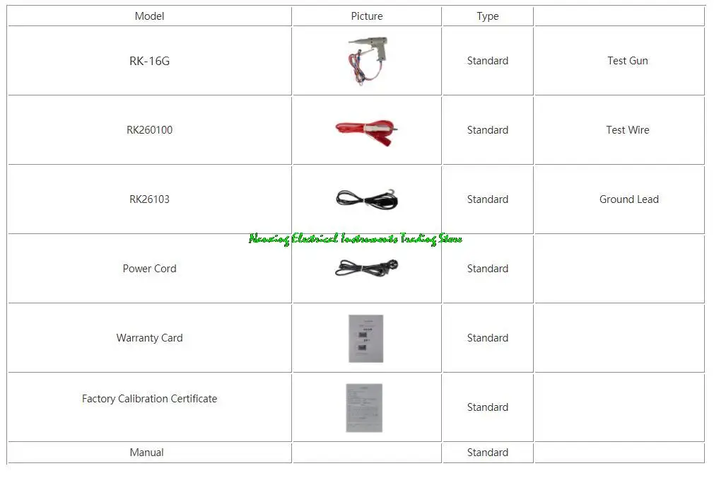 МодельRK2670YMRK2672YMВыходное напряжениеПеременный ток0-5KV0-5KVПостоянный ток--0-5KVТестовый токПеременный ток0-2/20 мАПостоянный ток--0-2/10 мАТочность тестирования±(5% + 3 слова)Время тестирования0,0 S-999S 0,0 = непрерывный тестЕмкость трансформатора100 ваИнтерфейс PLCОпциональноТребования к питаниюПеременный ток: 220 В ± 10% 50 Гц/60 Гц ± 3 ГцРабочая среда(0-40)℃,≤ 75% RHРазмеры320*270*180 ммВес8,5 кг9,5 кгАксессуарыИспытательные пистолеты высокого напряжения, BNC линии, заземляющие провода, линия электропередачи
