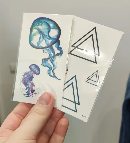 Татушки пришли довольно быстро. Их качеством я очень довольна. Перевела один самолётик в районе щиколотки, и вот уже больше недели хожу. Вообще не стирается. Рекомендую!!!