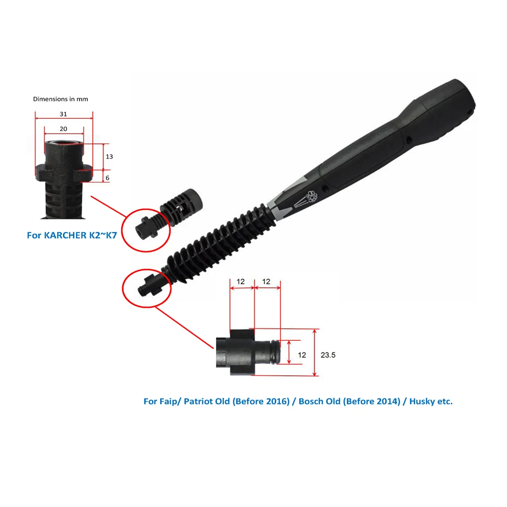 Важно:Так как существует два типа оружияДля этой марки моек высокого давления. Пожалуйста, проверьте размер соединения и убедитесь, что он подходит для вашей машины. Мы не несем ответственности за несовместимость пистолета и пистолета. Если вы не уверены, пожалуйста, свяжитесь с нами и отправьте нам фотографию вашего оригинального пистолета и пистолета, мы поможем выбрать подходящий продукт.