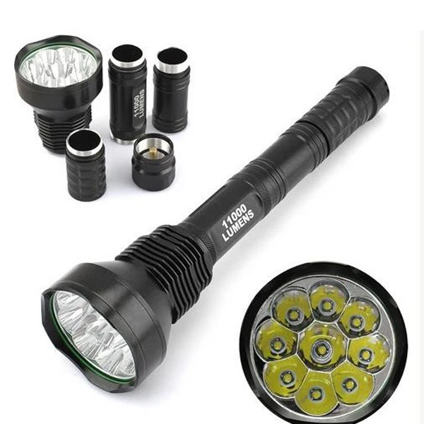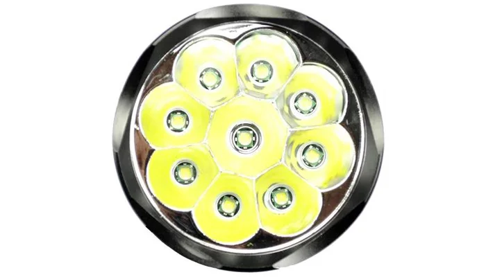 Цвет: черныйСветовой поток: 11000LMОтражатель: алюминий Гладкий/SMOМатериал: Алюминий из алюминиевого сплаваМодель светодиодный: 9 * CREE XM-L T6 Расположение в 5 режимах: Hi > Mid > Lo> Быстрый стробоскоп> Режим SOSБатарея: 2x18650 / 3x18650 / 2x26650 / 3x26650 (не входит в комплект)Объектив: стеклянный объектив с покрытиемЦвет: холодный белыйРазмеры: