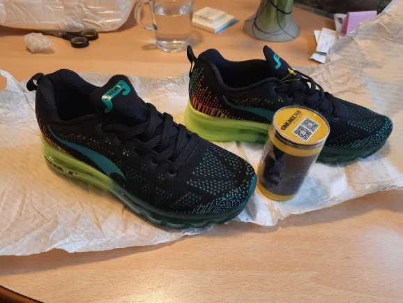 Опаянный 24 ноября, получил 18 декабря. Первый раз покупаю. Хороший продукт. Ткань правильной толщины (тонкая), гибкая, дышащая и выглядит несколько прочным. Подошва имеет среднюю гибкую подошву с прямым давлением воздуха внутри. Это удобно. В целом хорошая обувь. Время покажет, не будет ли подошва расклеена или что-то такое. Я уверен, что это будет. Вы не можете ошибиться с этим. Удар за бак. В комплект входят пара носков. Действительно приятно ~ могу ли я купить еще? Да. Измерьте стопу, чтобы убедиться. Европейский размер, я ношу 44 и американский размер 10,5. Поэтому я измерил свой размер и следовал их размерам. Хорошо сидит.