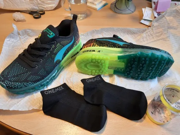Кроссы супер! Доставка около 2-х недель до Тольятти. Завернуты в бумагу из коробки, но самой коробки не было. Сверху только почтовая пленка, но достаточно плотная. Не пахнут! В комплекте черные шнурки и белые короткие носки моего размера! Плюс сами кроссы идеально подошли на мой 44-45. Стопу не мерил, основывался на отзывах и размерной сетке! Рекомендую товар и продавца! Спасибо Onemix