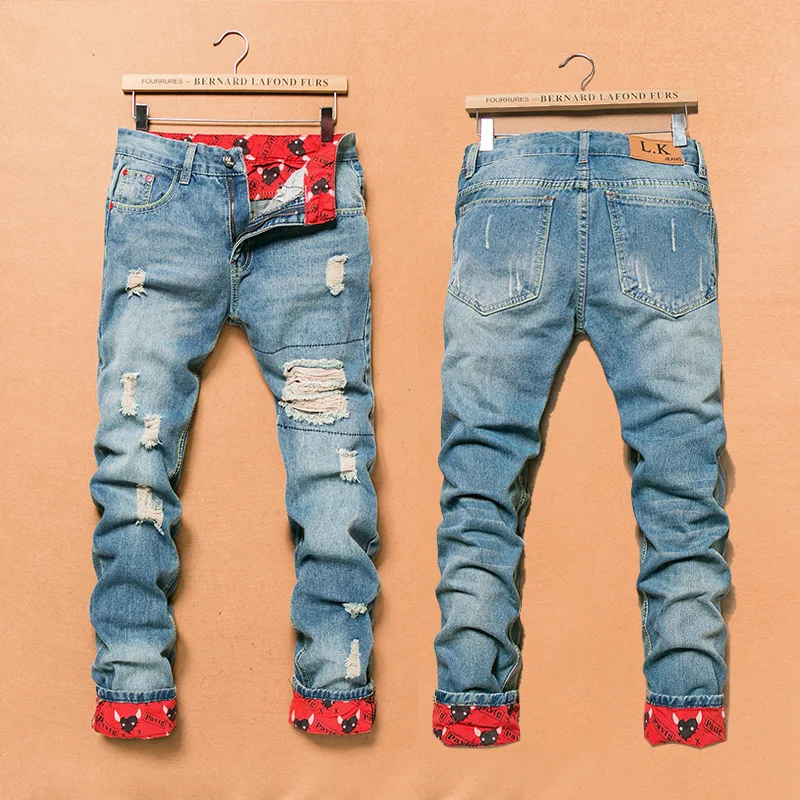 Мужские рваные джинсы с принтом, повседневные зауженные прямые джинсы в стиле ретро, длинные брюки из денима с принтом и полными отверстиями